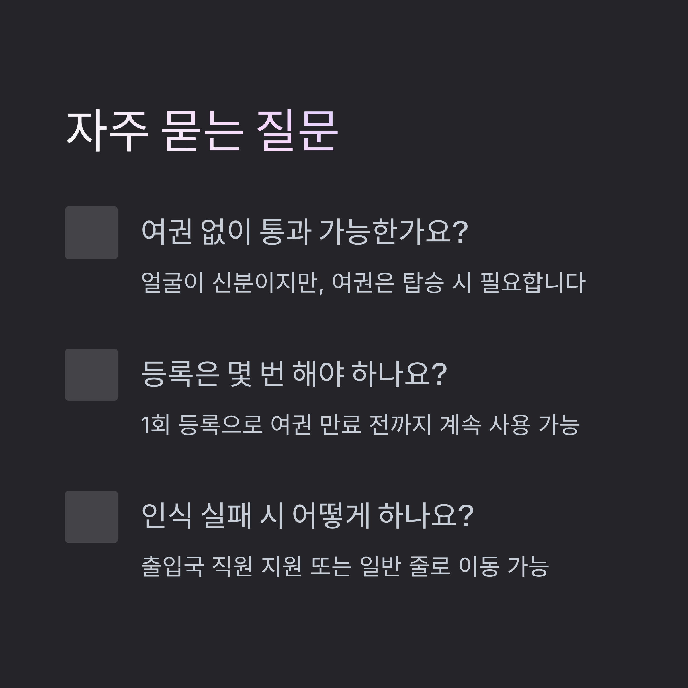 탑승권, 여권, 지문 확인 없이 얼굴만 인식되면 자동으로 출입국 심사가 끝납니다.