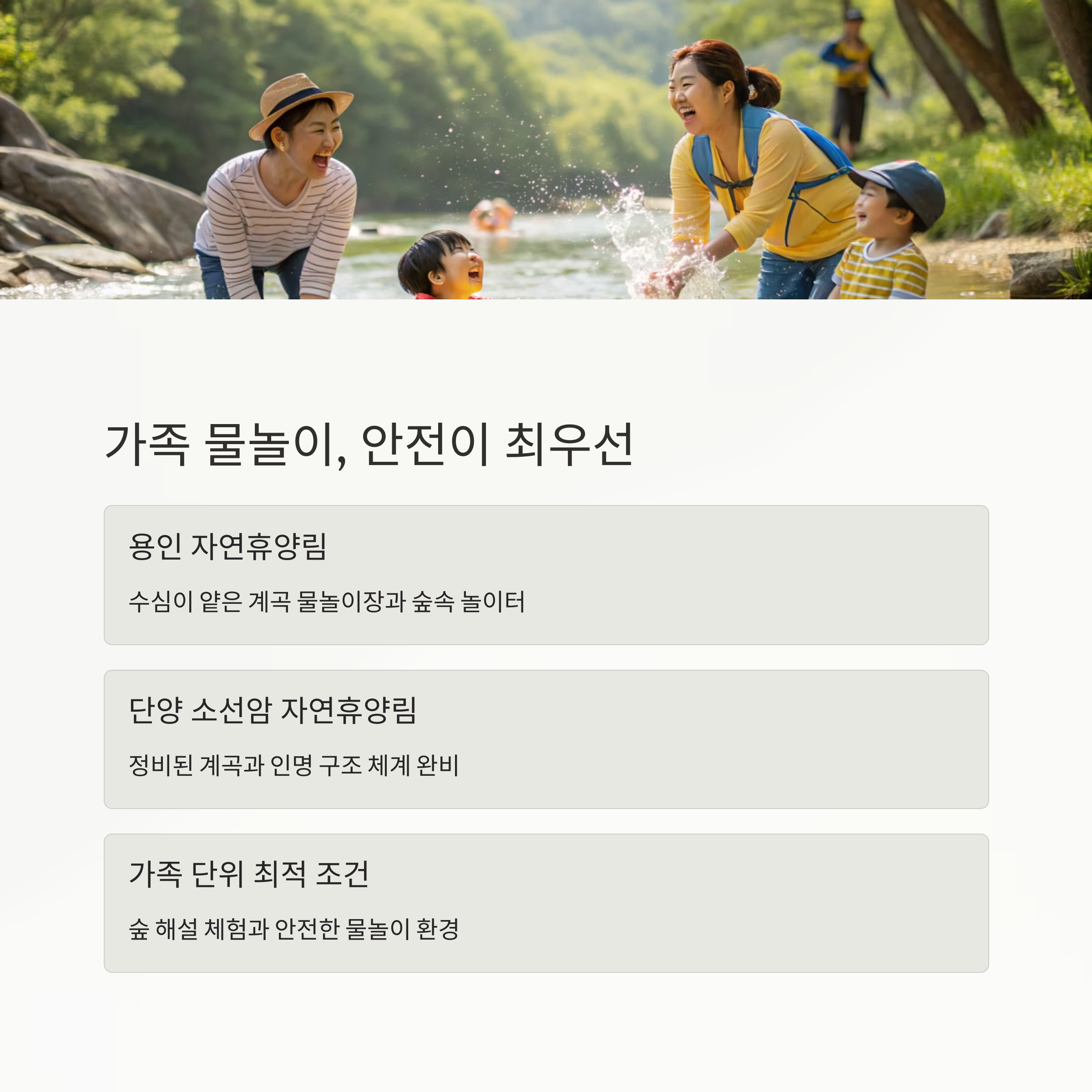 대표적으로 용인 자연휴양림 내 계곡, 단양 소선암 자연휴양림은