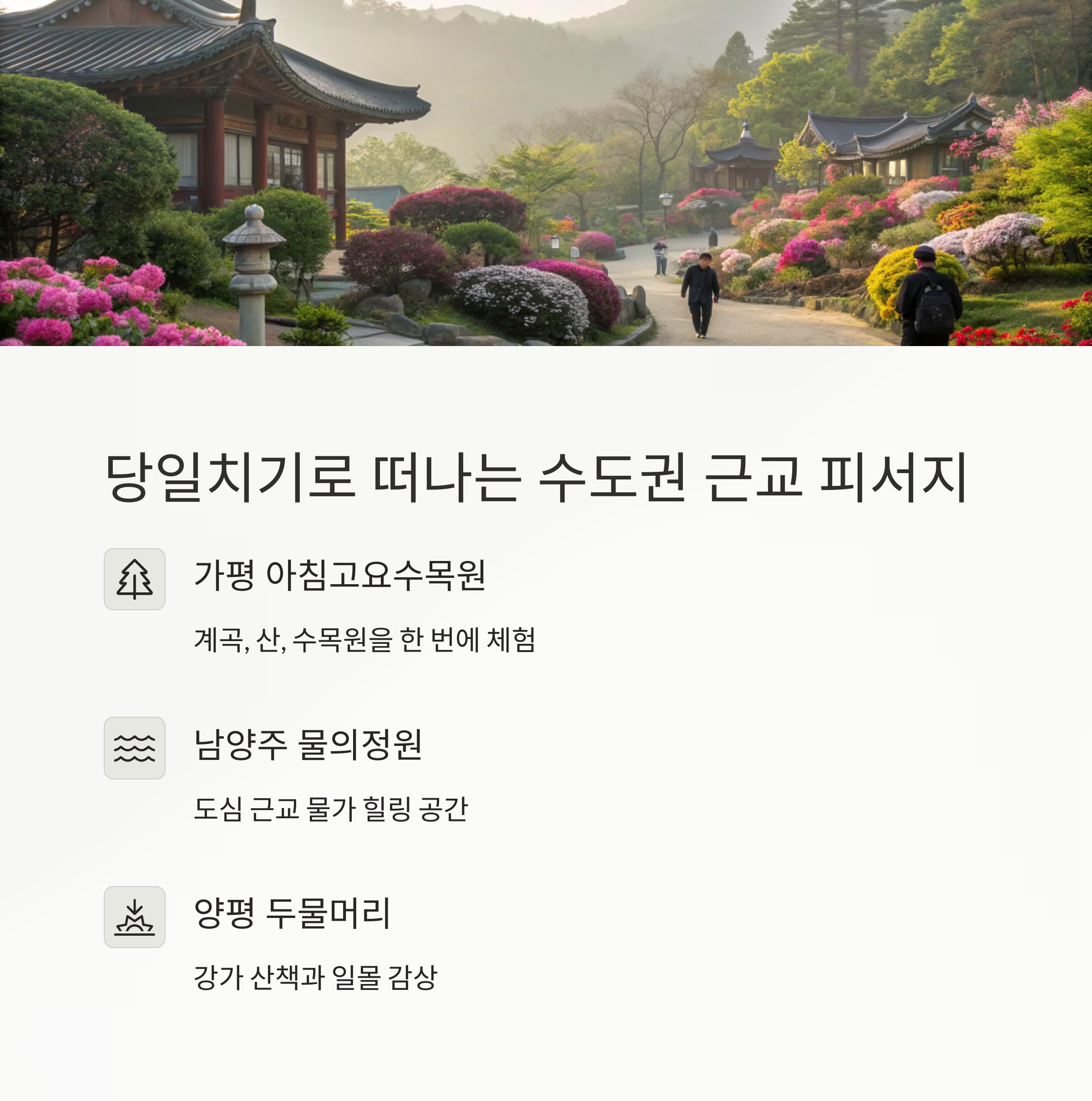 가평 아침고요수목원, 남양주 물의정원, 양평 두물머리 등이 있습니다.