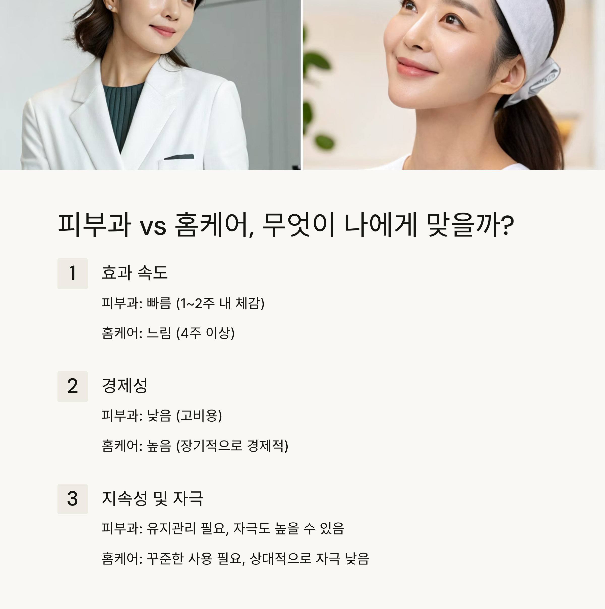 반면 홈케어는 매일 실천 가능하고 장기적으로 보면 경제적이지만, 효과를 체감하기까지 시간이 필요합니다.