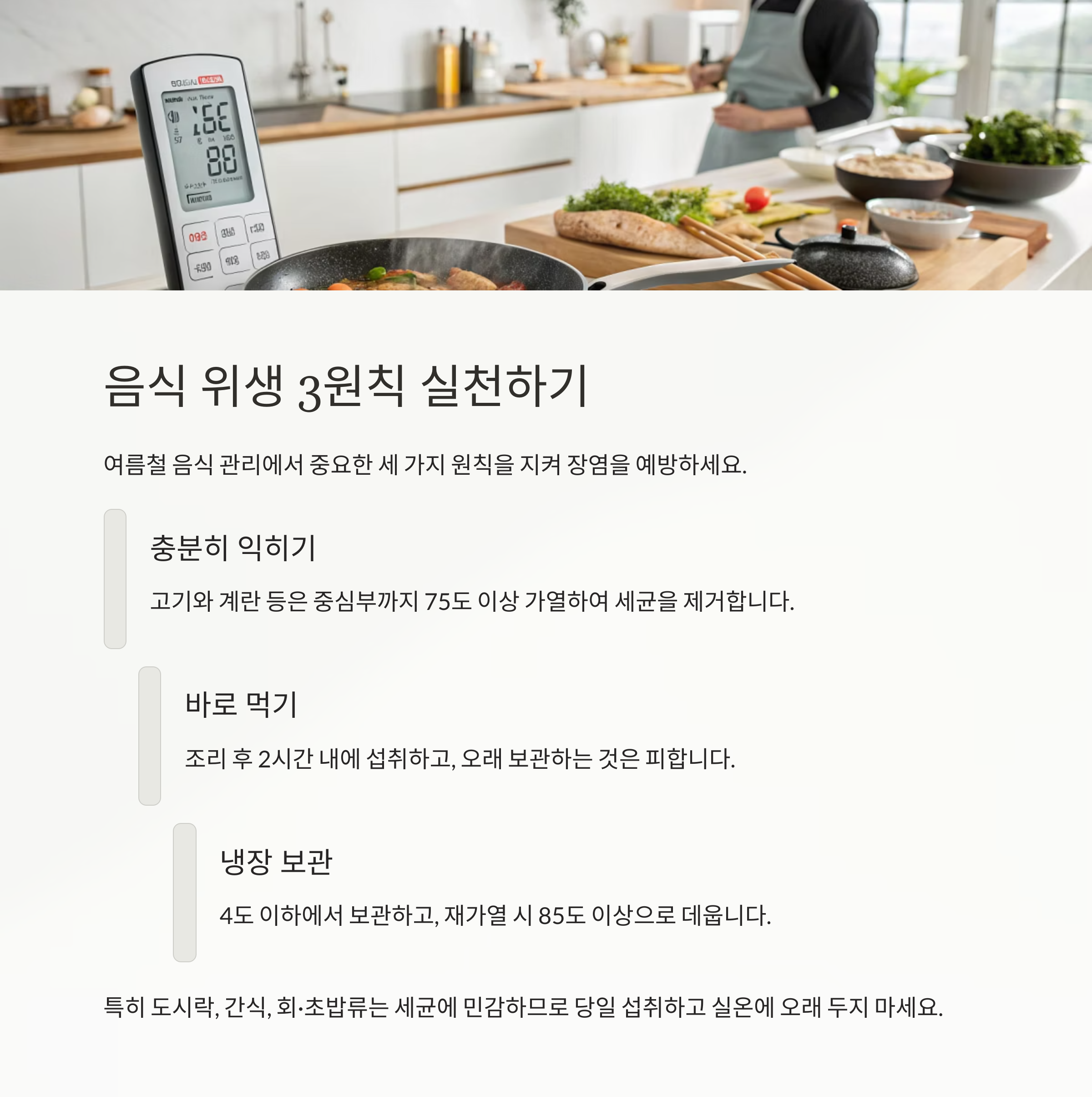 여름철 음식 관리에서 중요한 건 세 가지입니다.