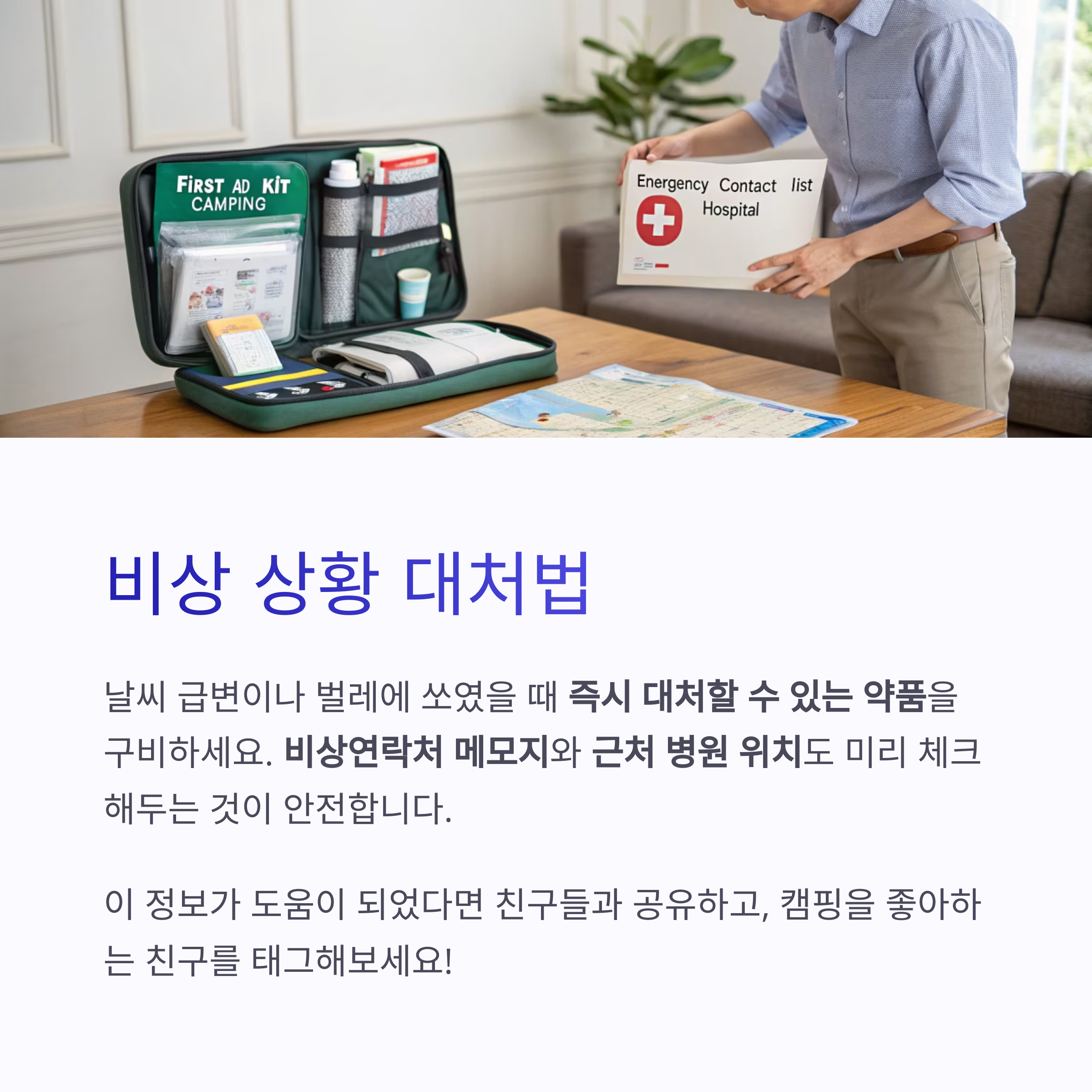 날씨가 급변하거나 벌레에 쏘였을 경우, 즉시 대처할 수 있는 약품을 구비해야 하며