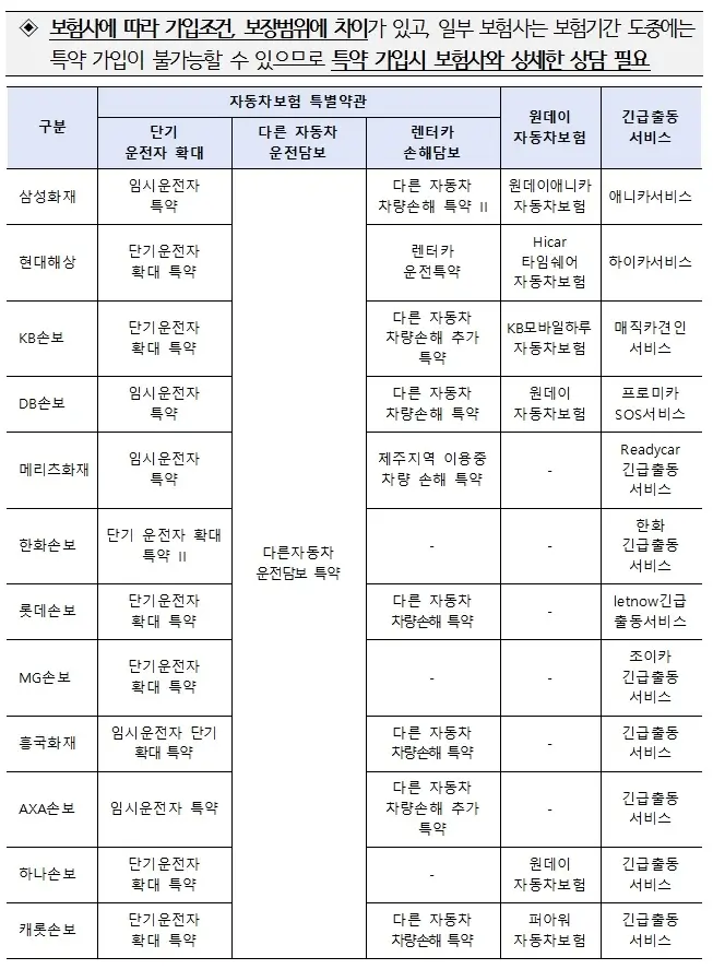 2. 보험사에 따라 특약 명칭과 보장조건(보상한도 등)이 상이할 수 있고, 공유차량(카쉐어링), 외제차, 승차정원 10인 초과차량 등은 가입이 불가할 수 있으니 가입시 보험사와 상세한 상담이 필요합니다.