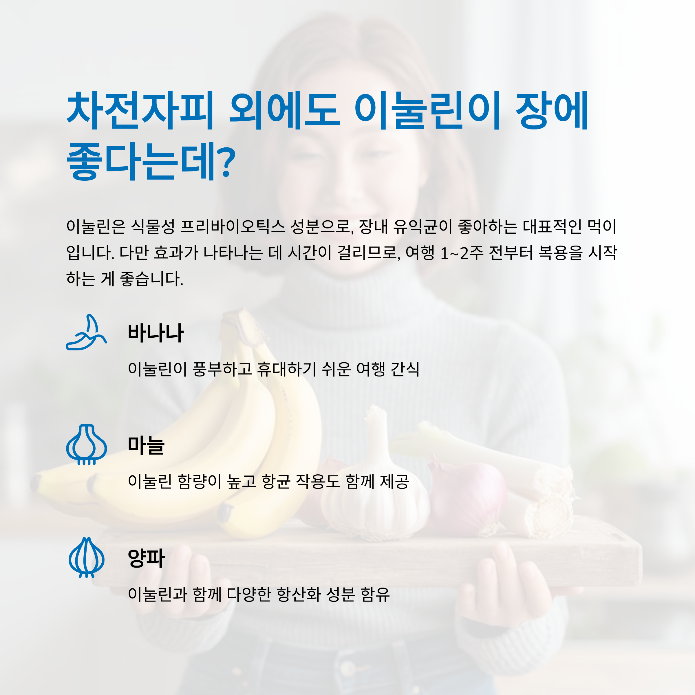 이눌린은 식물성 프리바이오틱스 성분으로, 장내 유익균이 좋아하는 대표적인 먹이입니다. 다만 효과가 나타나는 데 시간이 걸리므로, 여행 1~2주 전부터 복용을 시작하는 게 좋습니다. 바나나, 치커리 뿌리, 마늘, 양파 등에도 이눌린이 풍부하니 식단에서 함께 활용해보세요.