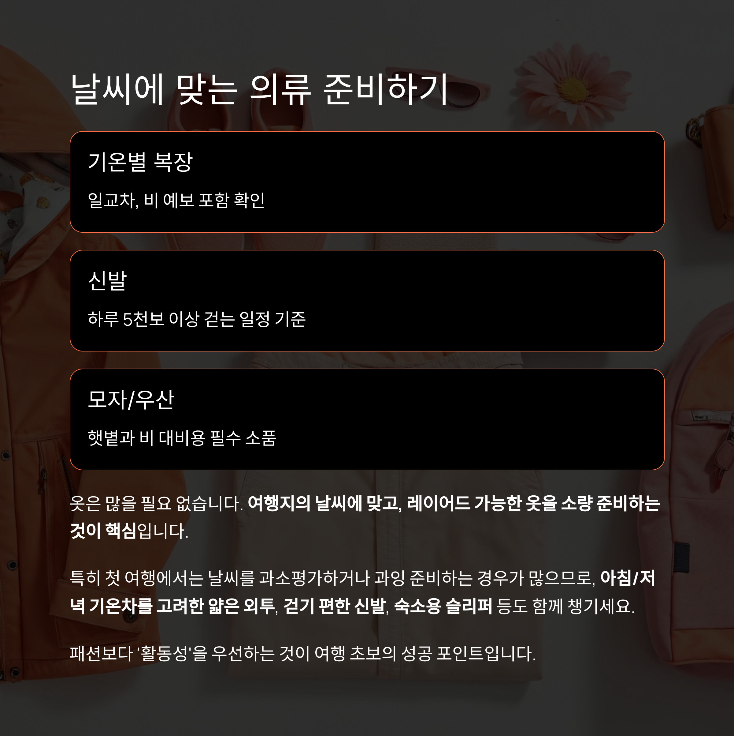 여행지의 날씨에 맞고, 레이어드 가능한 옷을 소량 준비하는 것이 핵심입니다.