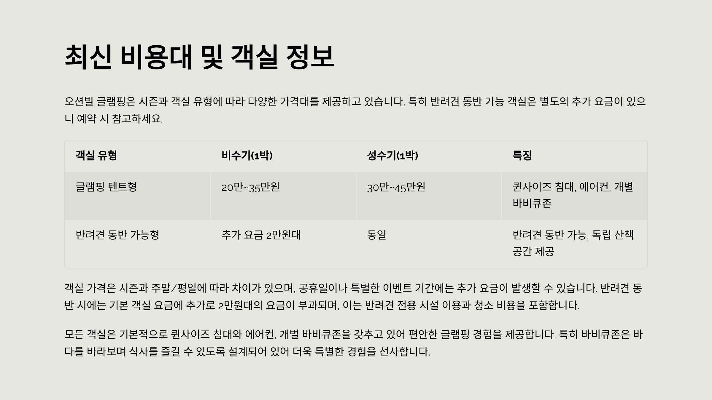 | 글램핑 텐트형 | 20만~35만원 | 30만~45만원 | 퀸사이즈 침대, 에어컨, 개별 바비큐존 |