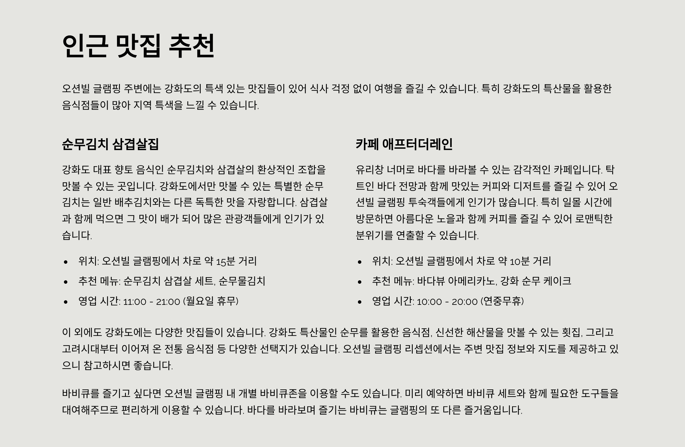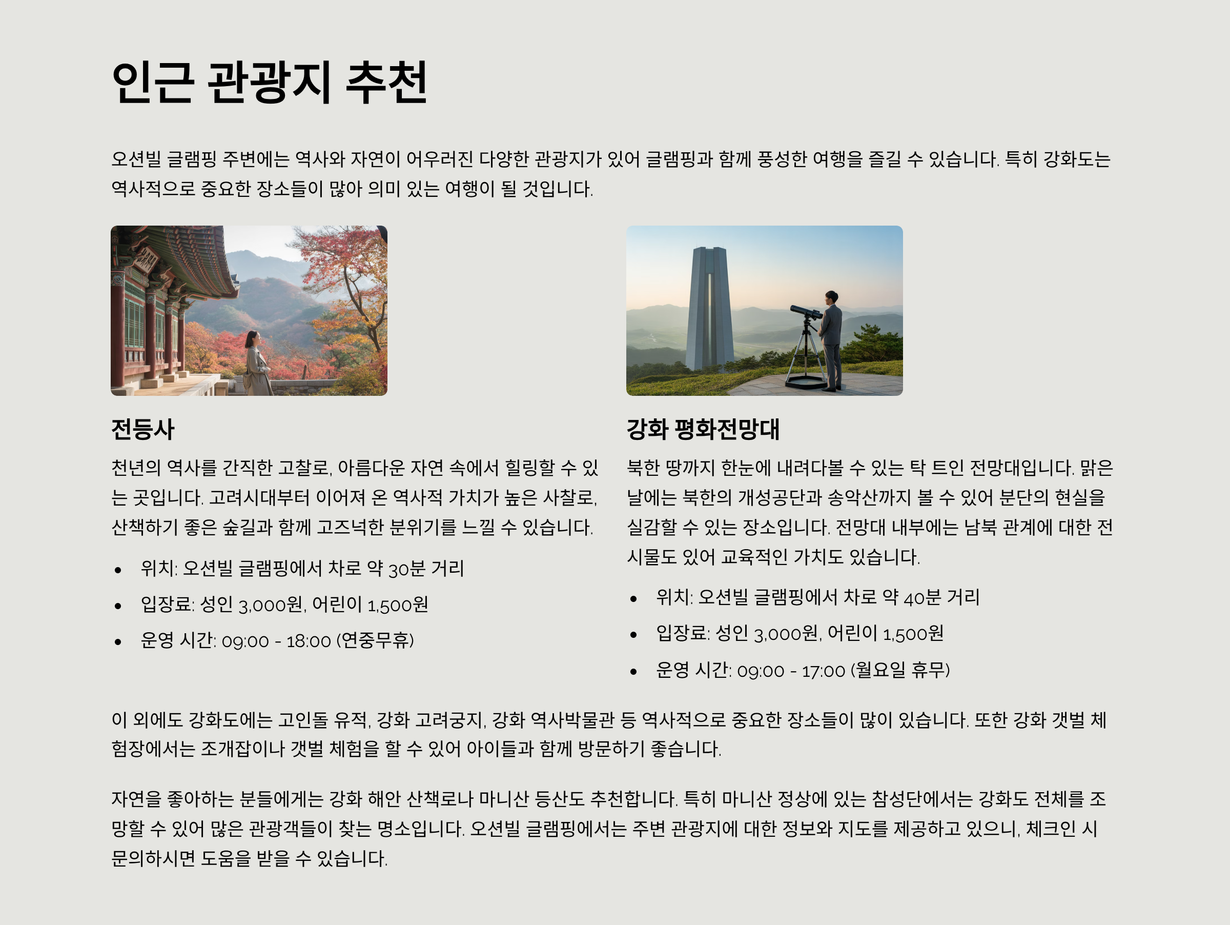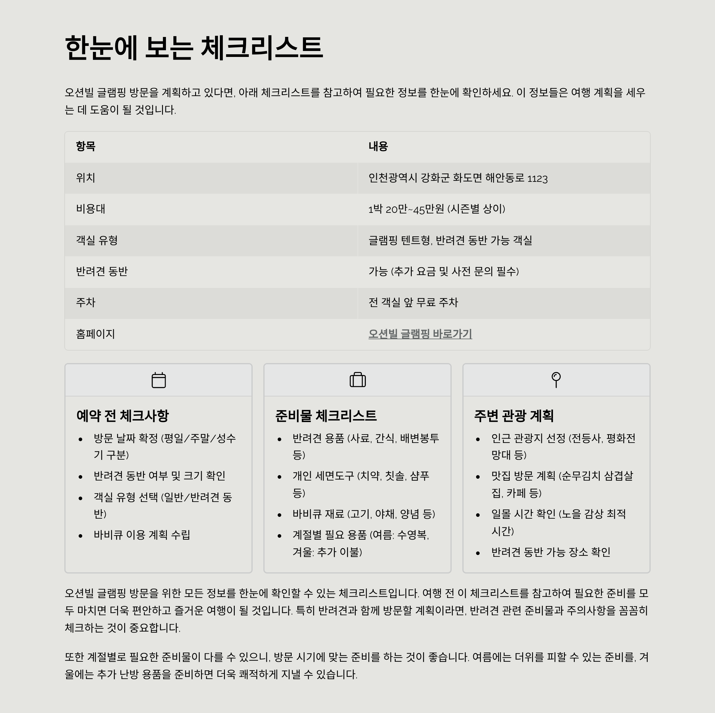 서해의 노을과 파도 소리를 배경으로 감성 가득한 글램핑을 즐길 수 있는 곳. 인천 강화 오션빌 글램핑은 특히 반려견과 함께하는 여행자들에게 인기입니다. 이번 글에서는 위치, 최신 비용대, 객실 정보, 인근 맛집·관광지, 예약 팁, 그리고 실제 방문객 후기를 모두 담아봤습니다.