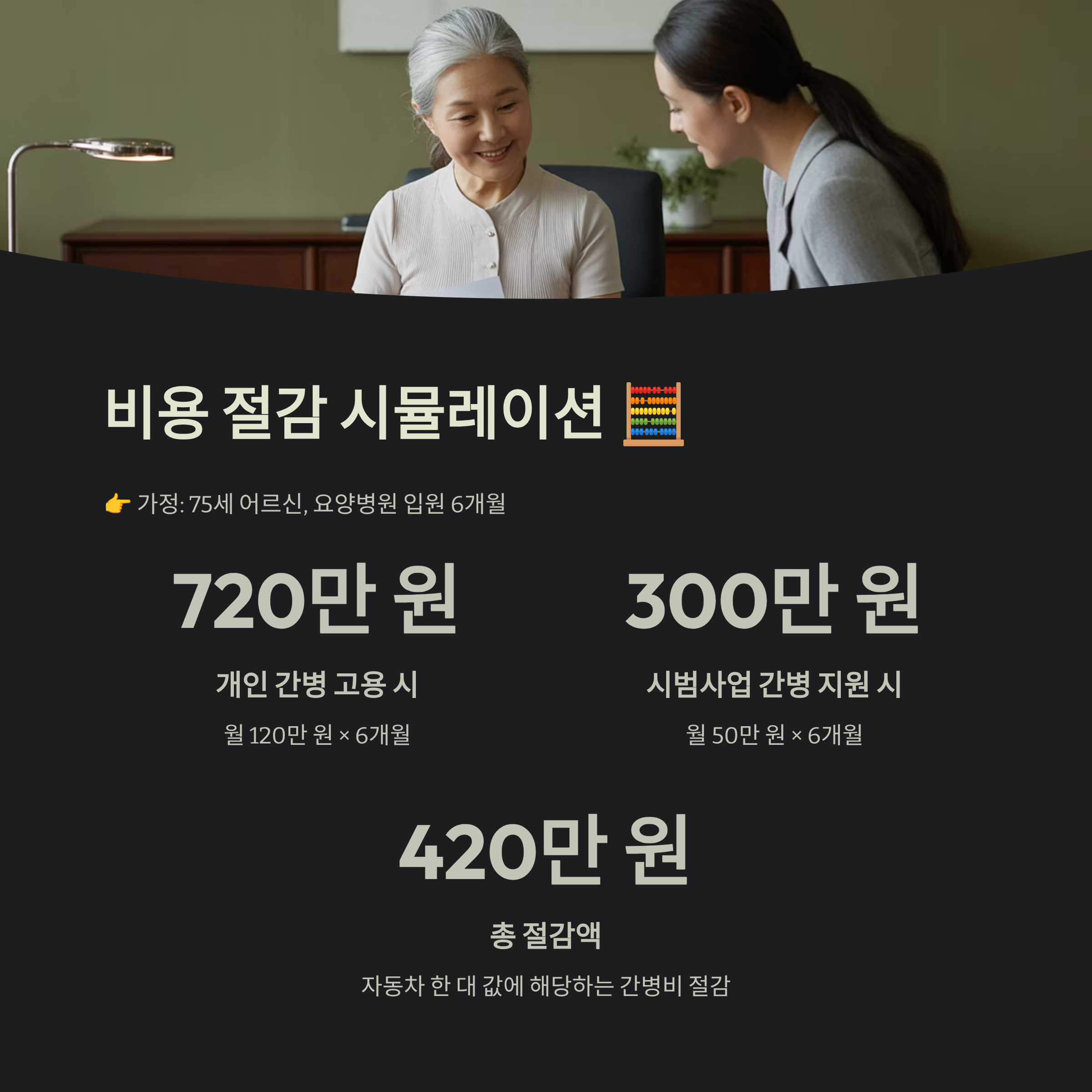 즉, 시범사업을 활용하면 6개월 동안 자동차 한 대 값에 해당하는 간병비 절감 효과를 누릴 수 있습니다.