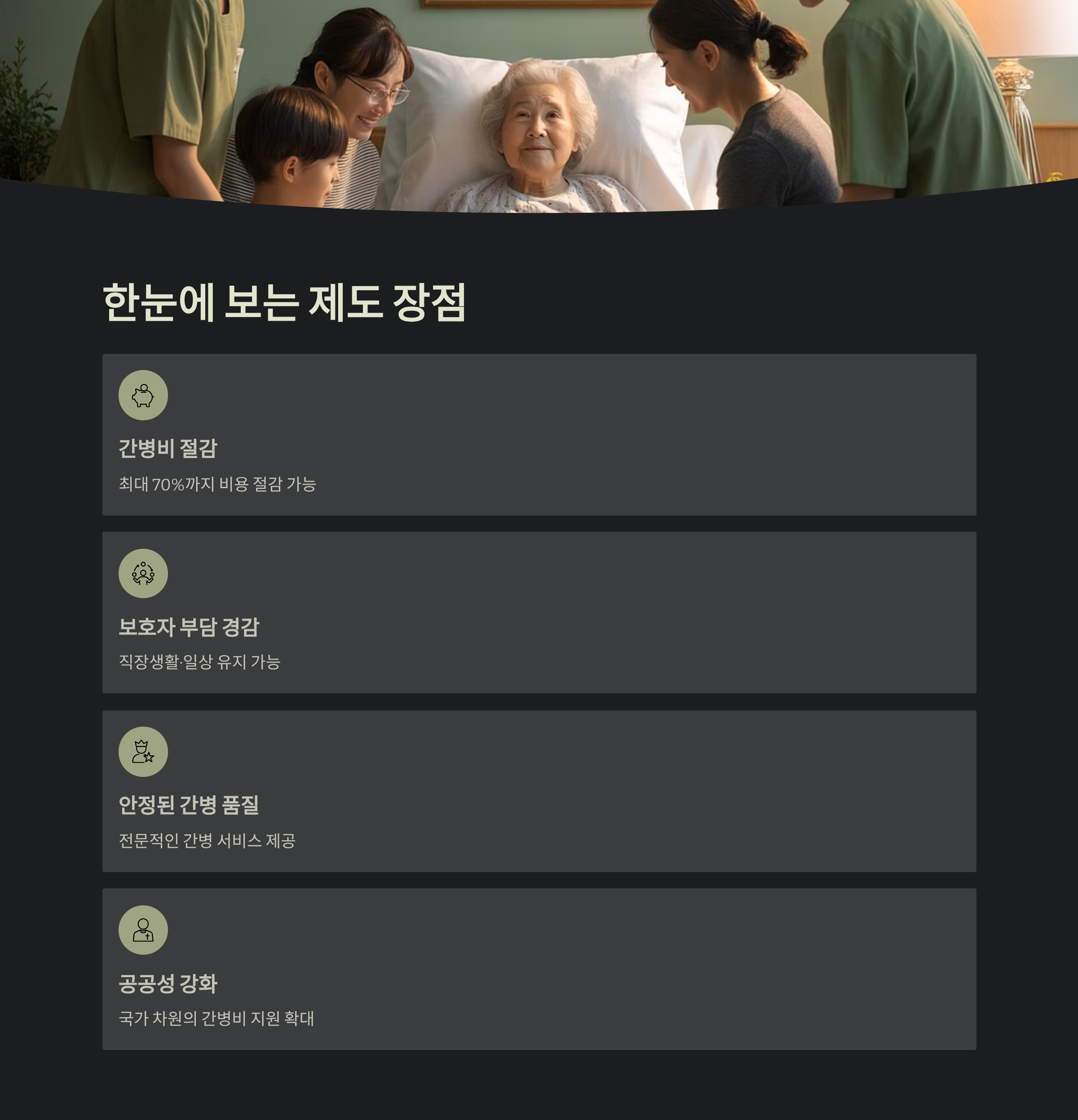 - 시범사업 간병 서비스 → 병원이 공용 간병인 운영, 건강보험 지원 + 보호자 일부 부담