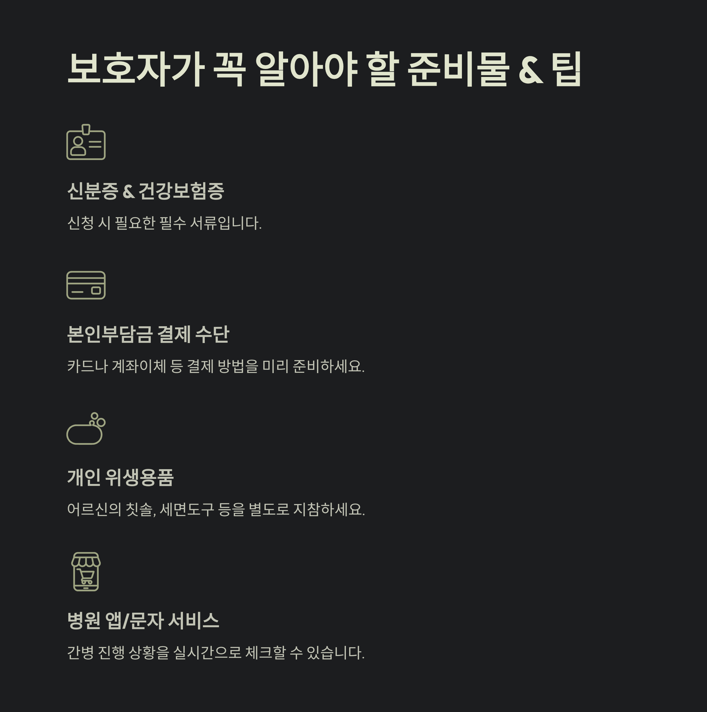 - 📱 병원 앱 또는 문자 알림 서비스 활용 → 간병 진행 상황 체크