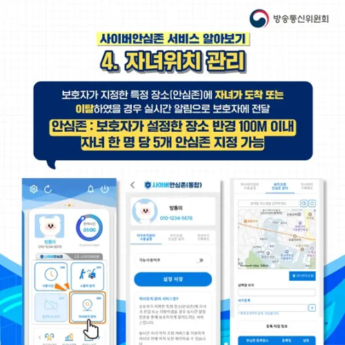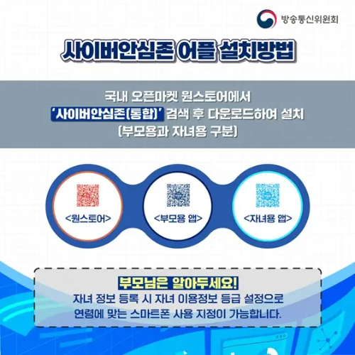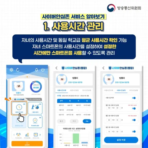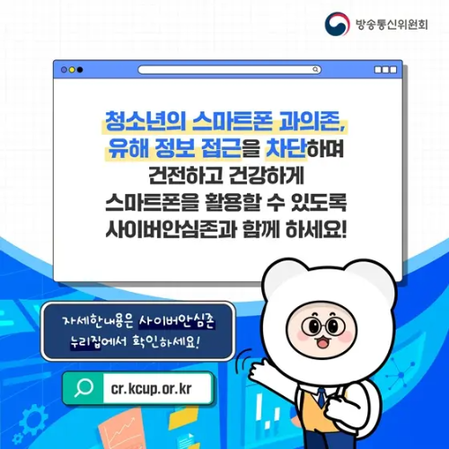 청소년들이 스마트폰에 지나치게 의존하게 되면 학업에도 영향을 미칠 뿐만 아니라, 신체적·정신적 건강에도 악영향을 끼칠 수 있습니다. 이 문제를 해결하기 위해 방송통신위원회는 청소년의 스마트폰 중독을 예방할 수 있는 ‘사이버안심존’ 어플을 2013년부터 무상으로 제공하고 있습니다.