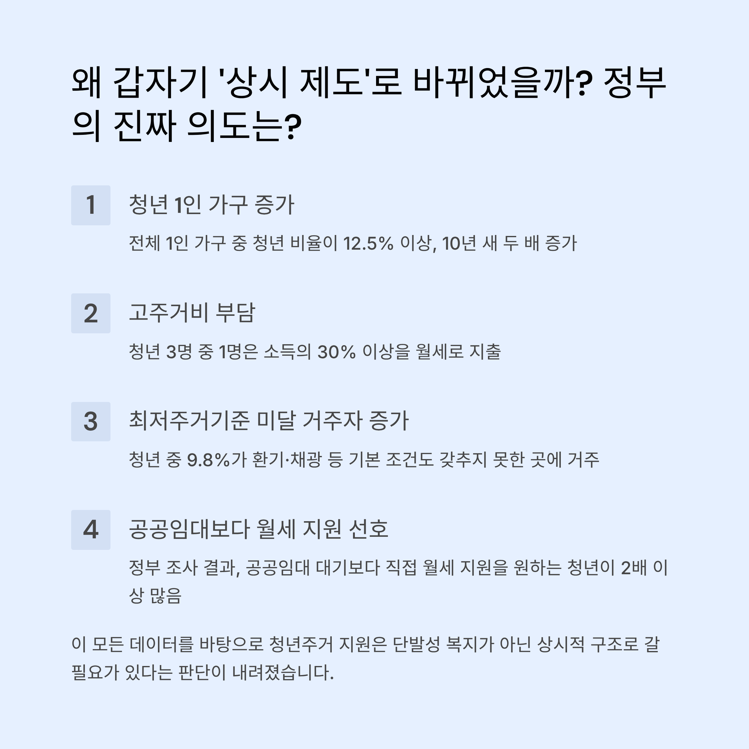 이 모든 데이터를 바탕으로 청년주거 지원은 단발성 복지가 아닌 상시적 구조로 갈 필요가 있다는 판단이 내려졌습니다.