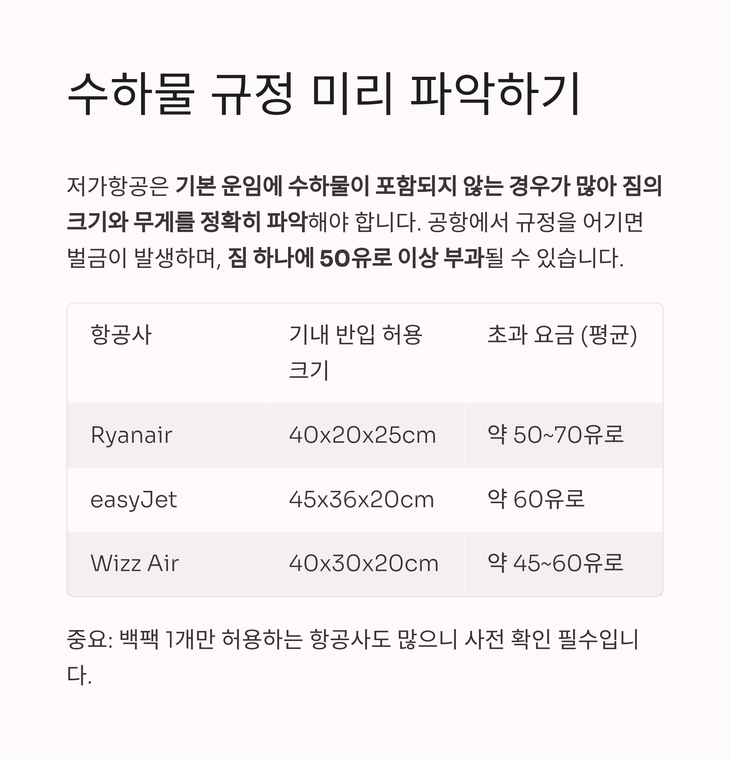 | Ryanair | 40x20x25cm | 약 50~70유로 |