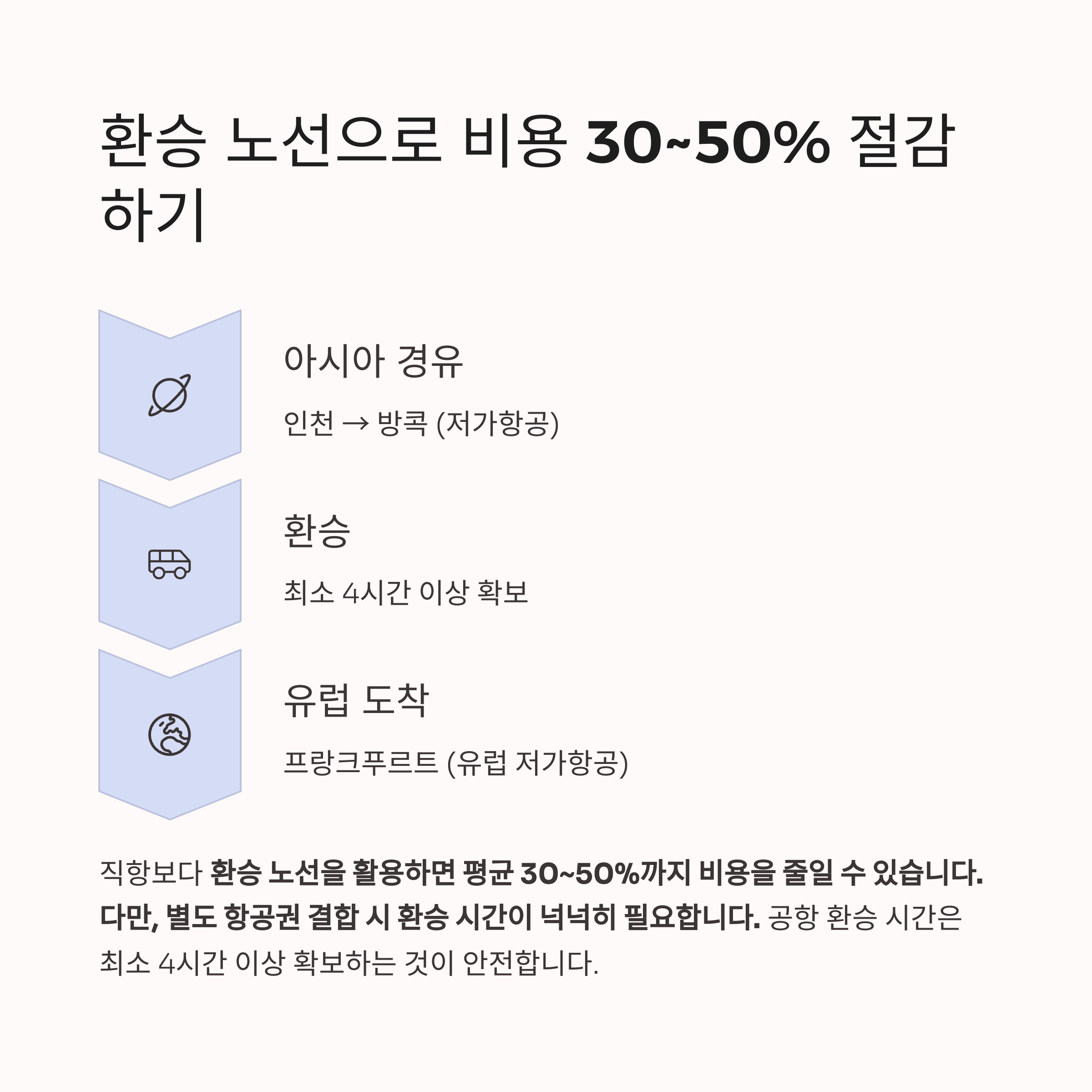 직항보다 환승 노선을 활용하면 평균 30~50%까지 비용을 줄일 수 있습니다.
