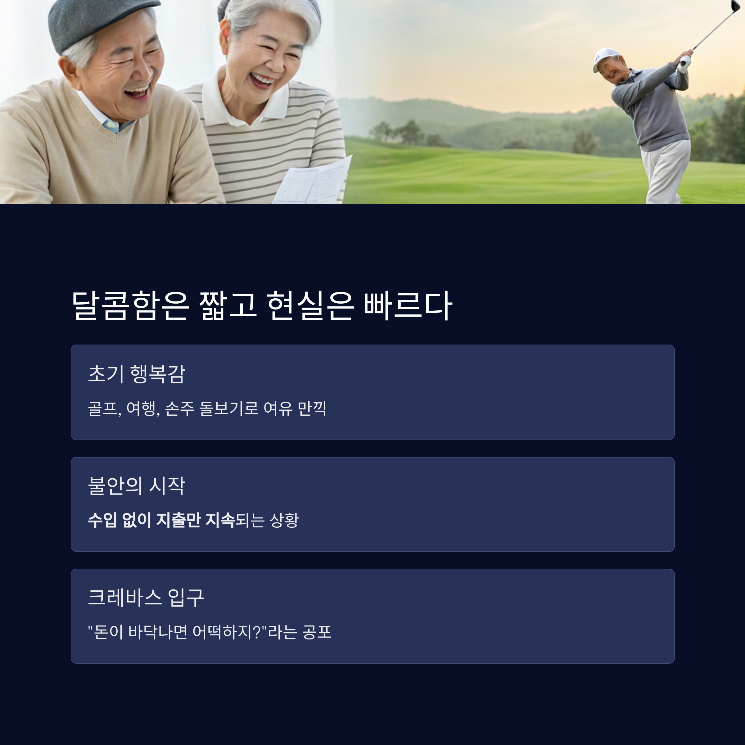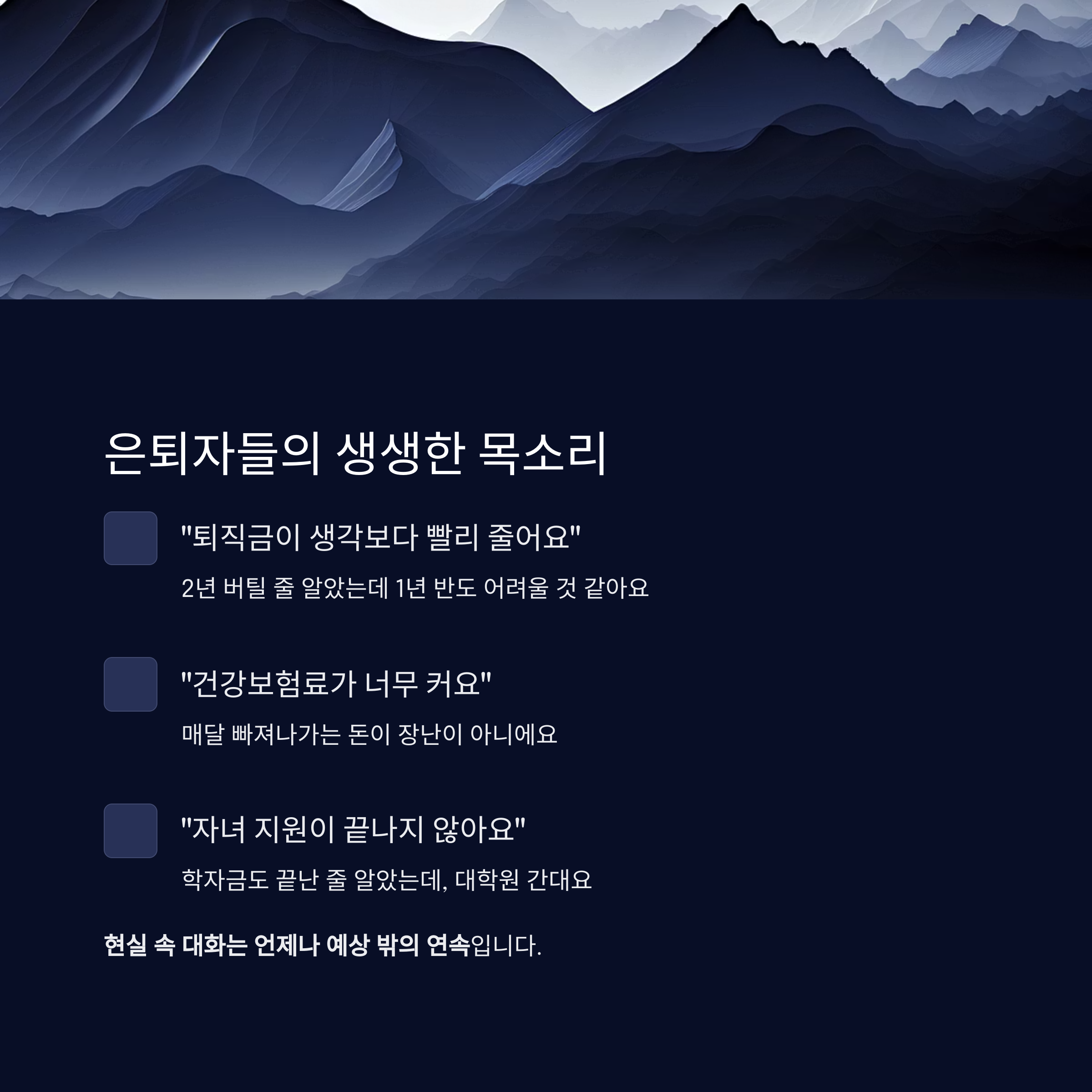 불확실한 건강 비용, 그리고 무엇보다 **'수입 없는 삶에 대한 공포'**입니다.