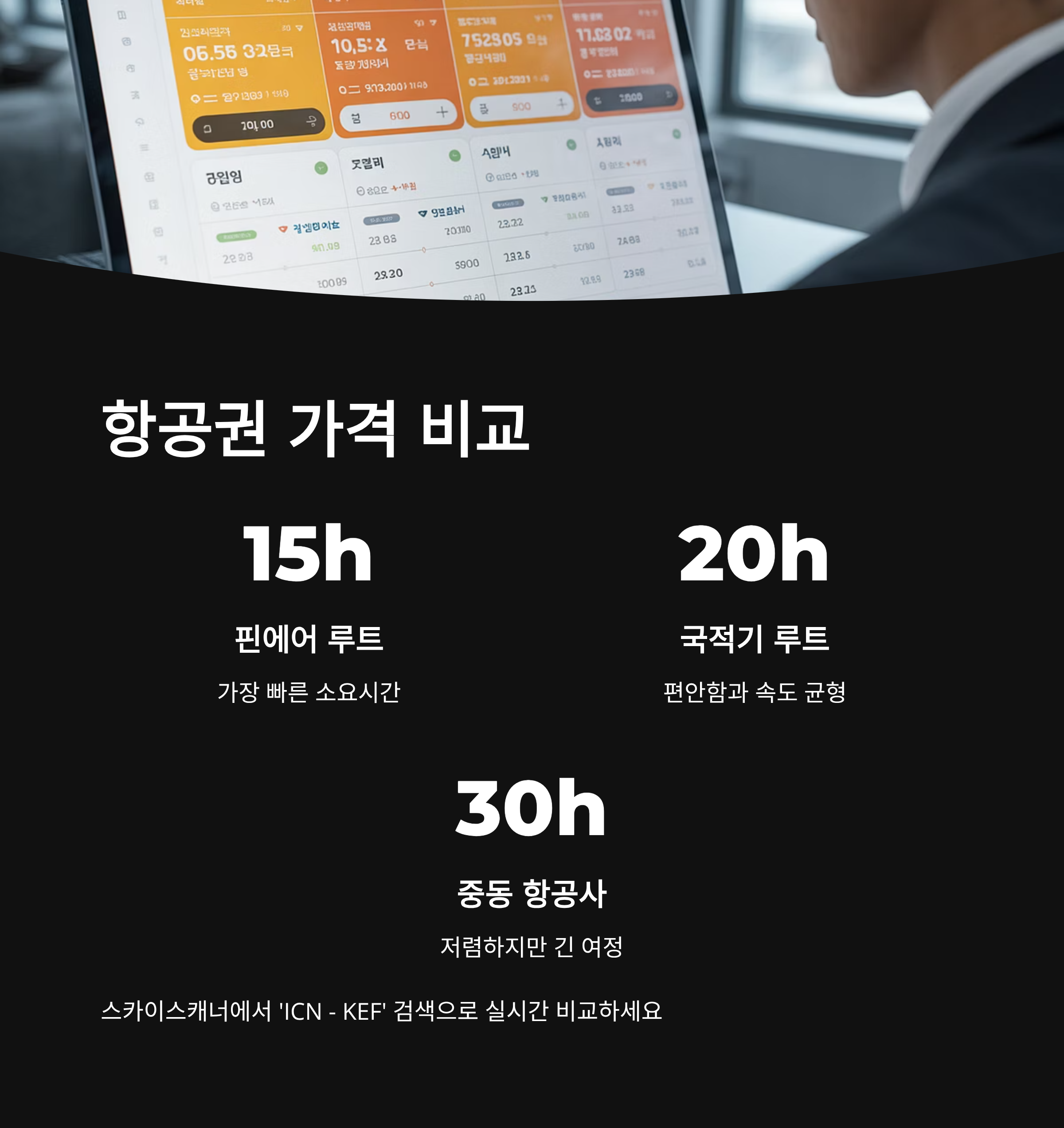 - 왜 좋을까? 지구본을 위에서 내려다보면 답이 나옵니다. 한국에서 유럽으로 갈 때 북극 항로를 이용하는 핀란드가 지리적으로 가장 가깝습니다. 인천에서 헬싱키까지 약 13~14시간, 환승 대기 후 아이슬란드까지 약 3시간 30분이면 도착합니다. 환승 시간이 짧게는 2시간 내외로 잡히는 스케줄도 있어, 총 소요 시간을 획기적으로 줄일 수 있습니다.