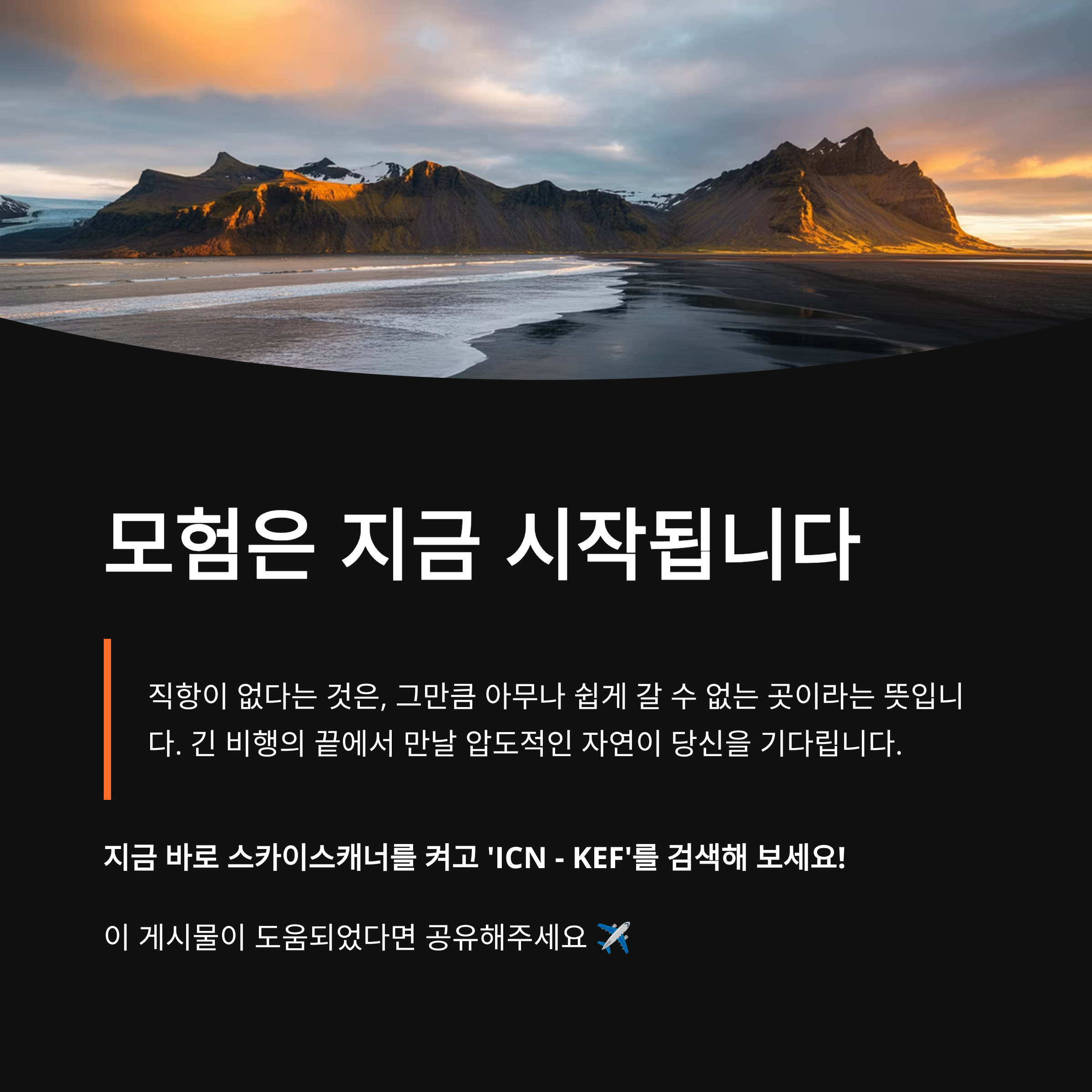 여러분의 아이슬란드 여행이 단순한 관광이 아닌, 인생의 잊지 못할 모험이 되기를 응원합니다. 지금 바로 스카이스캐너를 켜고 'ICN - KEF'를 검색해 보세요. 모험은 거기서부터 시작됩니다.