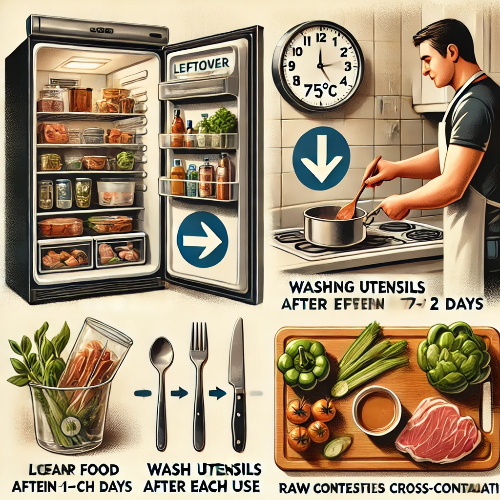 | 남은 음식 | 박테리아 증식, 미흡한 재가열 | 1-2일 내 섭취, 75℃ 이상 재가열 |