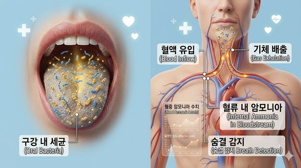 배출되지 못한 암모니아가 혈액 속에 쌓이게 되고, 이 혈액이 폐로 전달되어 숨을 쉴 때 밖으로 나오게 되는 것이죠. 이것을 의학적으로는 '간성 구취(Fetoral hepaticus)'라고 불러요. 2026년 발표된 간 질환 백서에 따르면 혈중 암모니아 농도가 정상 범위인 15~45 µg/dL를 훨씬 초과할 때부터 숨결에서 특유의 냄새가 감지되기 시작한다고 해요. 단순히 입안이 텁텁한 수준이 아니라 몸 안의 독소가 숨결로 새어 나오는 현상인 셈이죠.