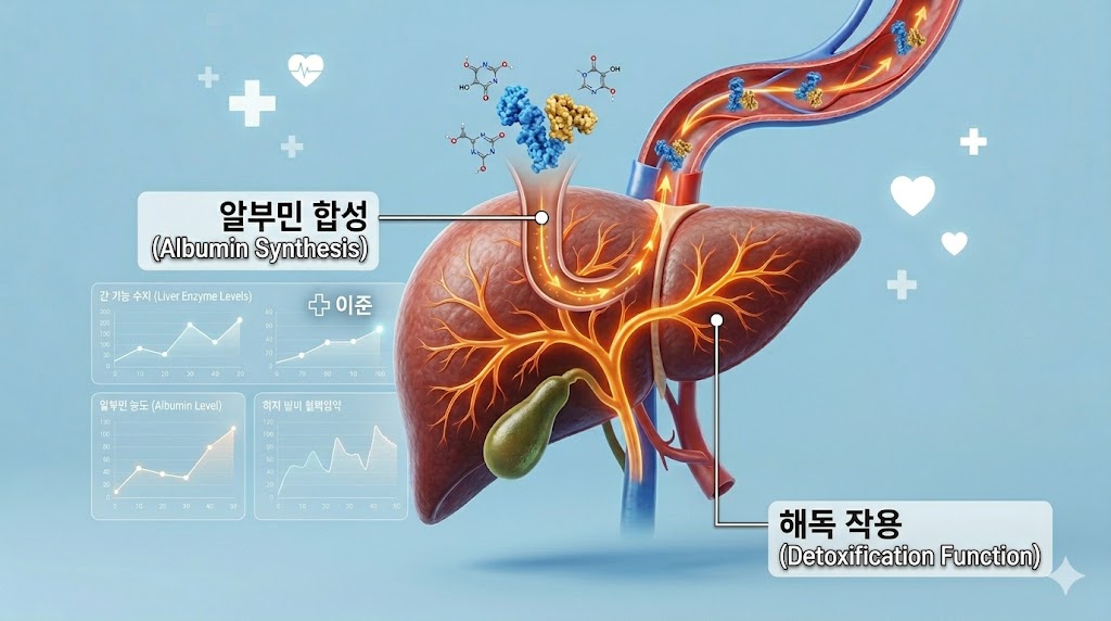 간은 우리 몸에서 단백질 대사 과정 중 발생하는 '암모니아'라는 독소를 '요소'로 바꾸어 소변으로 배출하는 역할을 담당해요. 그런데 간경화나 급성 간염 등으로 간 기능이 떨어지면 이 해독 시스템에 과부하가 걸리게 됩니다.