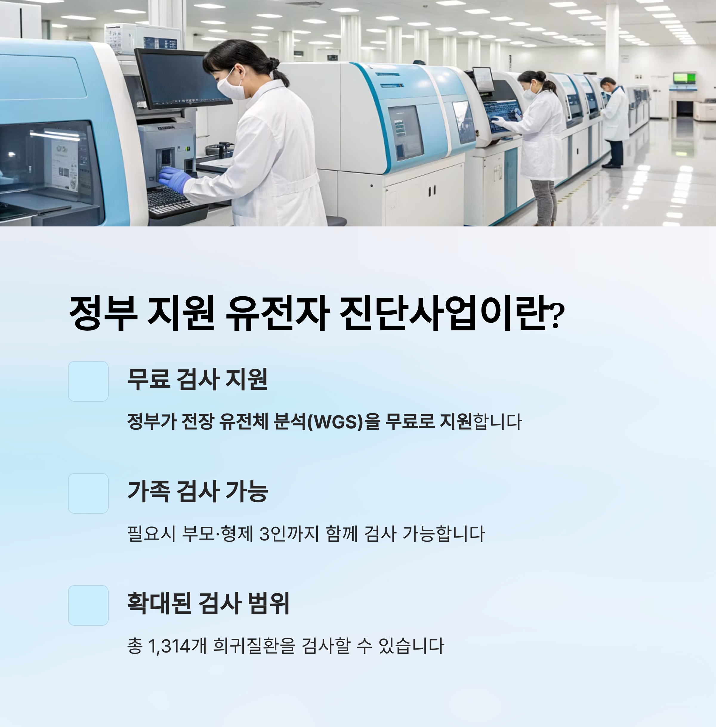 검사 항목은 총 1,314개 희귀질환으로 확대되었고, 소아 유전 질환의 상당수를 포함합니다.