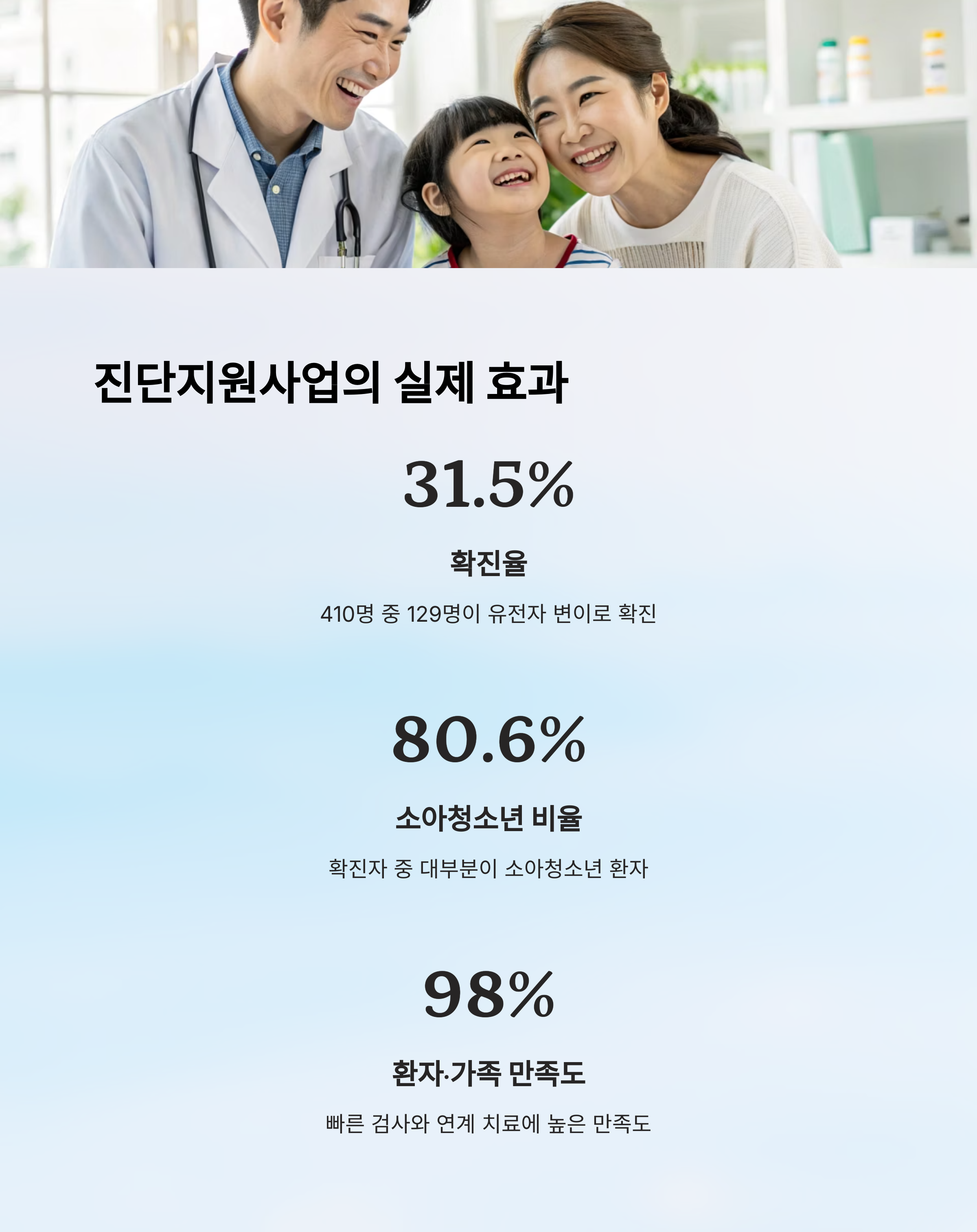 진단받은 가족 대다수가 빠른 검사 결과와 연계 치료에 매우 긍정적인 평가를 남겼습니다.