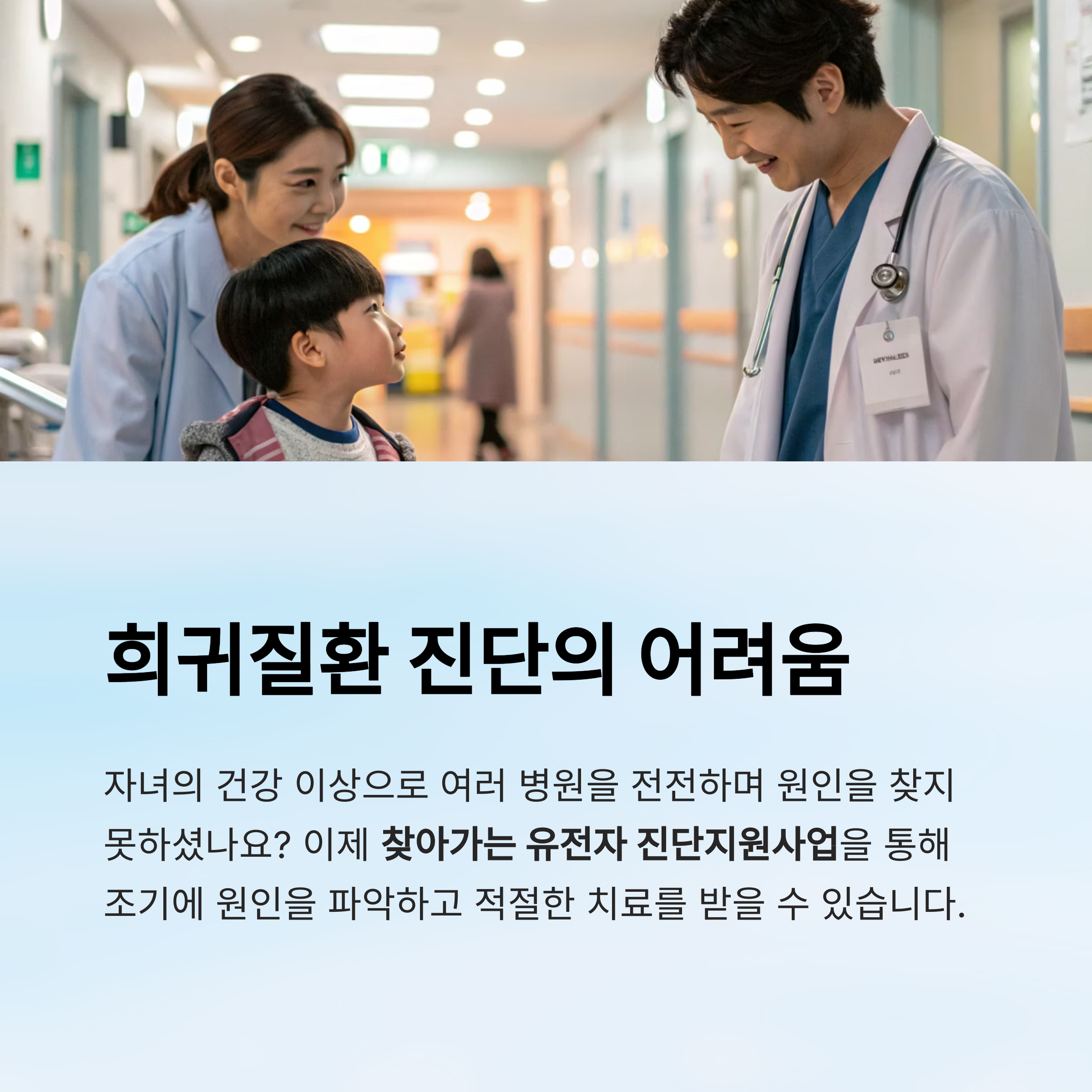 진단 후에는 치료 연계뿐만 아니라 의료비 지원, 유전자 치료 임상 참여 등의 혜택이 주어질 수 있습니다.