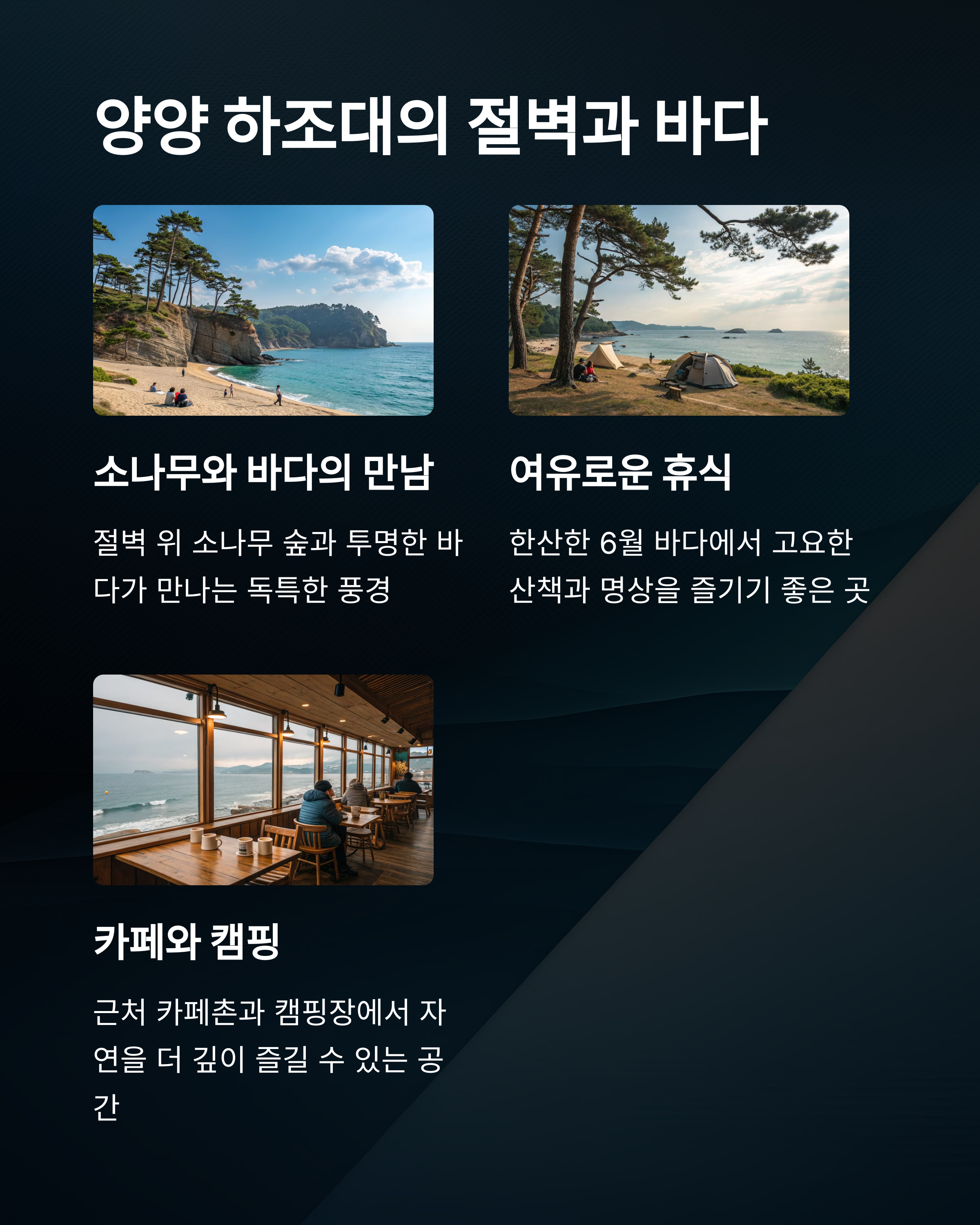 | 양양 하조대 | 절벽 위 소나무와 바다 풍경 | 캠핑족, 커플 | 카페촌, 야영 명소 |
