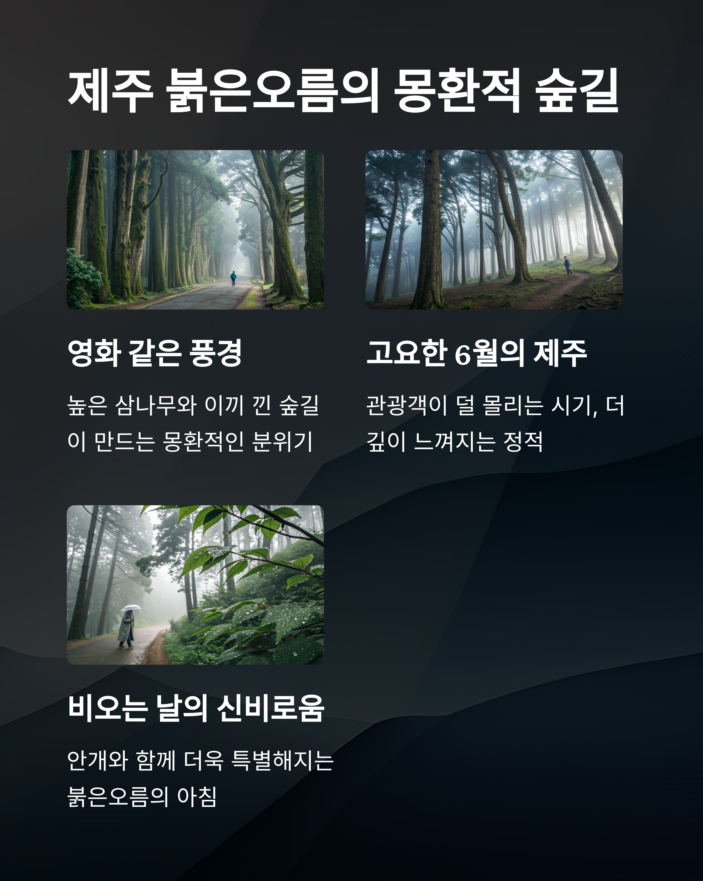 | 제주 붉은오름 | 삼나무 숲과 안개의 조화 | 자연 속 힐링 추구 | 비 오는 날 더 아름다운 풍경 |