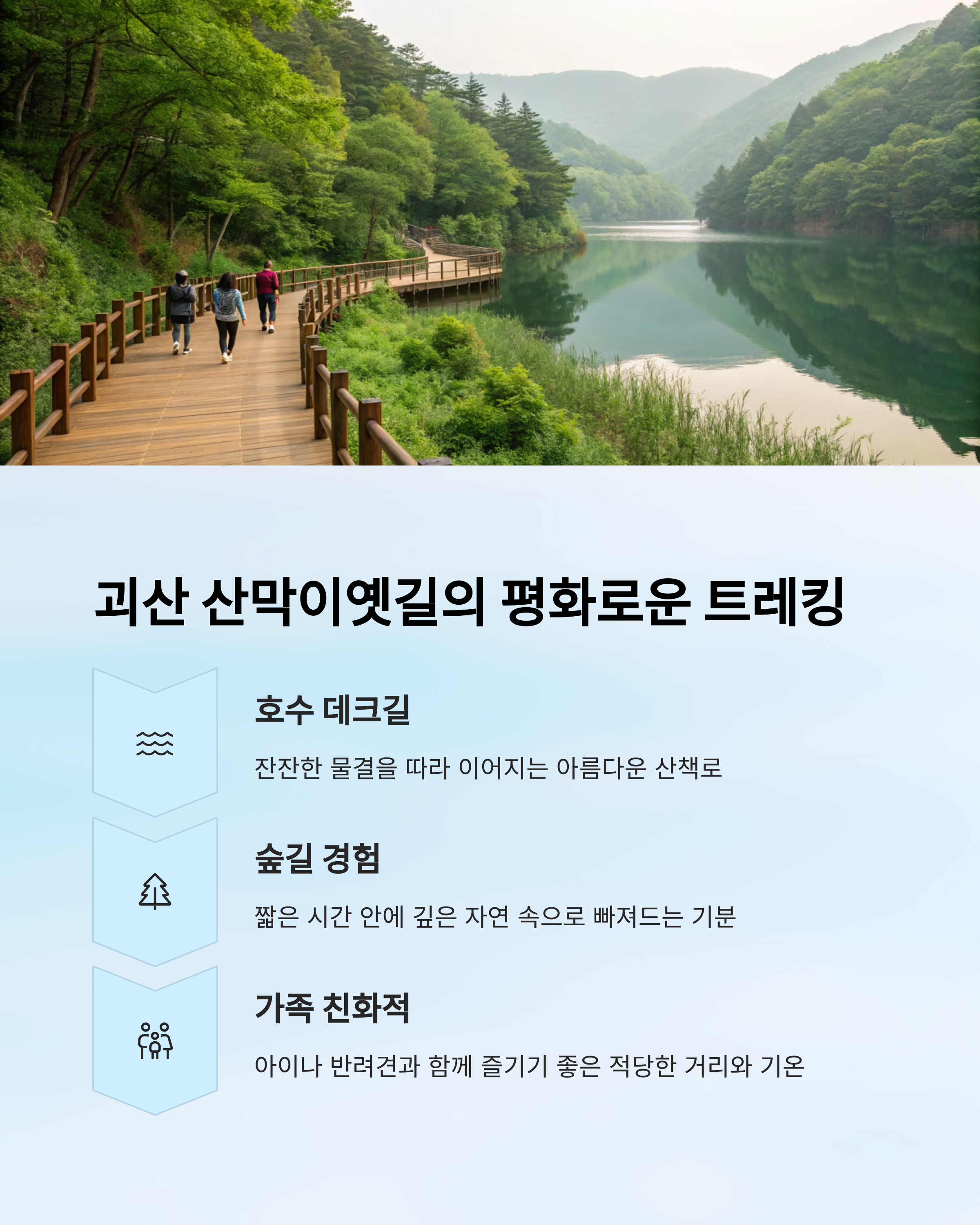 | 괴산 산막이옛길 | 호수 따라 걷는 숲길 | 가족, 반려견 동반 | 평탄한 데크길, 접근성 우수 |