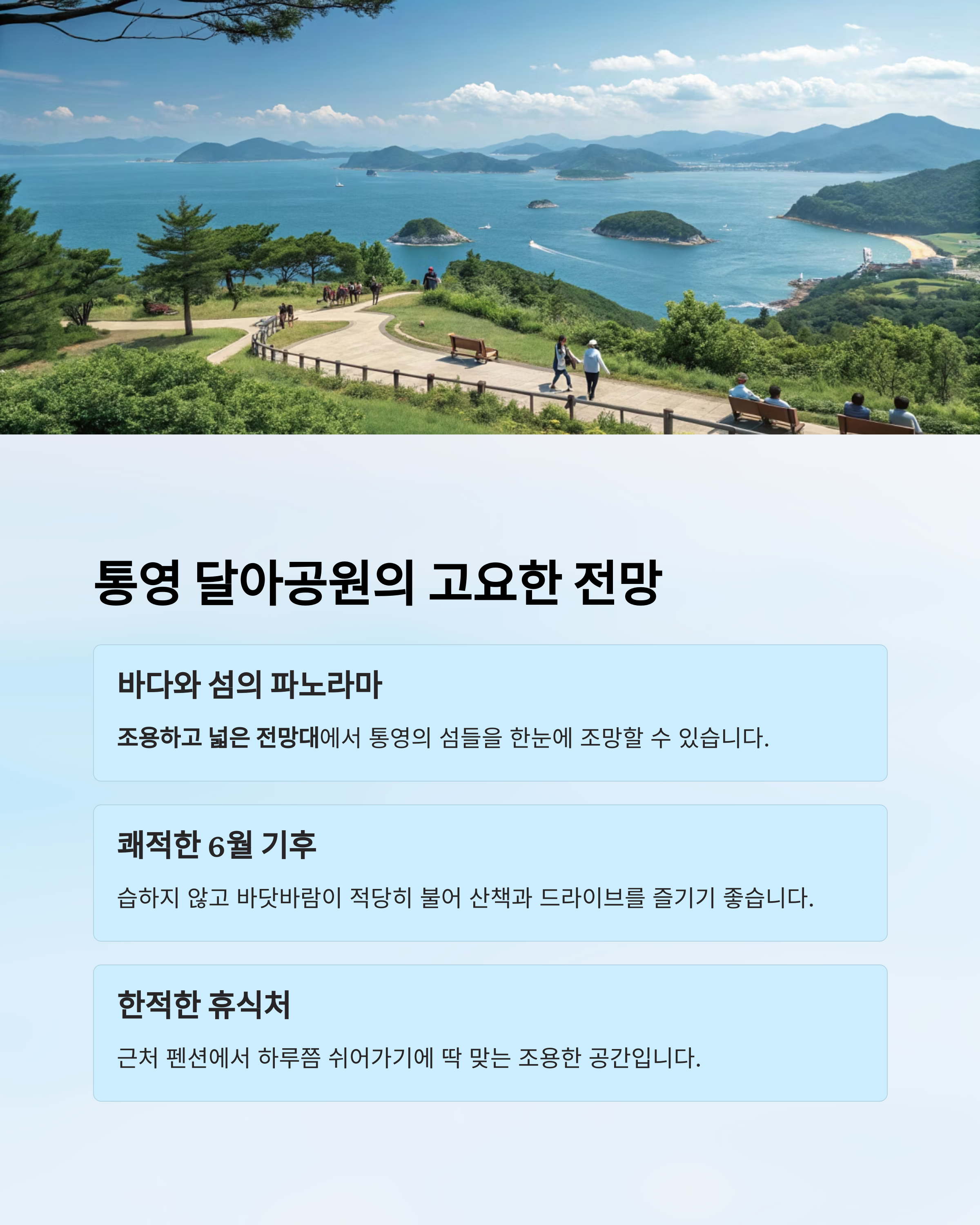 | 통영 달아공원 | 섬과 바다 한눈에 보이는 전망 | 조용한 여행 선호자 | 드라이브 코스 겸용 |