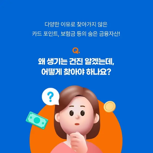 숨은 금융 자산의 주인공은 당신일 수도 있습니다. 계좌정보 통합관리 서비스 , 어카운트인포 앱 , 카드 포인트 통합조회 서비스 등을 이용하여 지금 바로 내 자산을 확인해보세요. 나중에 후회할 수 있습니다! 이 기회를 놓치지 마세요!
