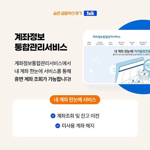 계좌관리 통합 관리 서비스 를 통해 모든 은행을 통해 한 번에 조회할 수 있습니다. 이 서비스를 사용하면 장기간 사용하지 않아 잊고 있던 계좌의 존재여부 및 잔액을 한 눈에 확인하고 소액 계좌는 온라인에서 손쉽게 잔고이전 및 해지할 수 있어 일상 금융생활의 편익과 개인 재산관리 효율성이 대폭 개선할 수 있습니다.