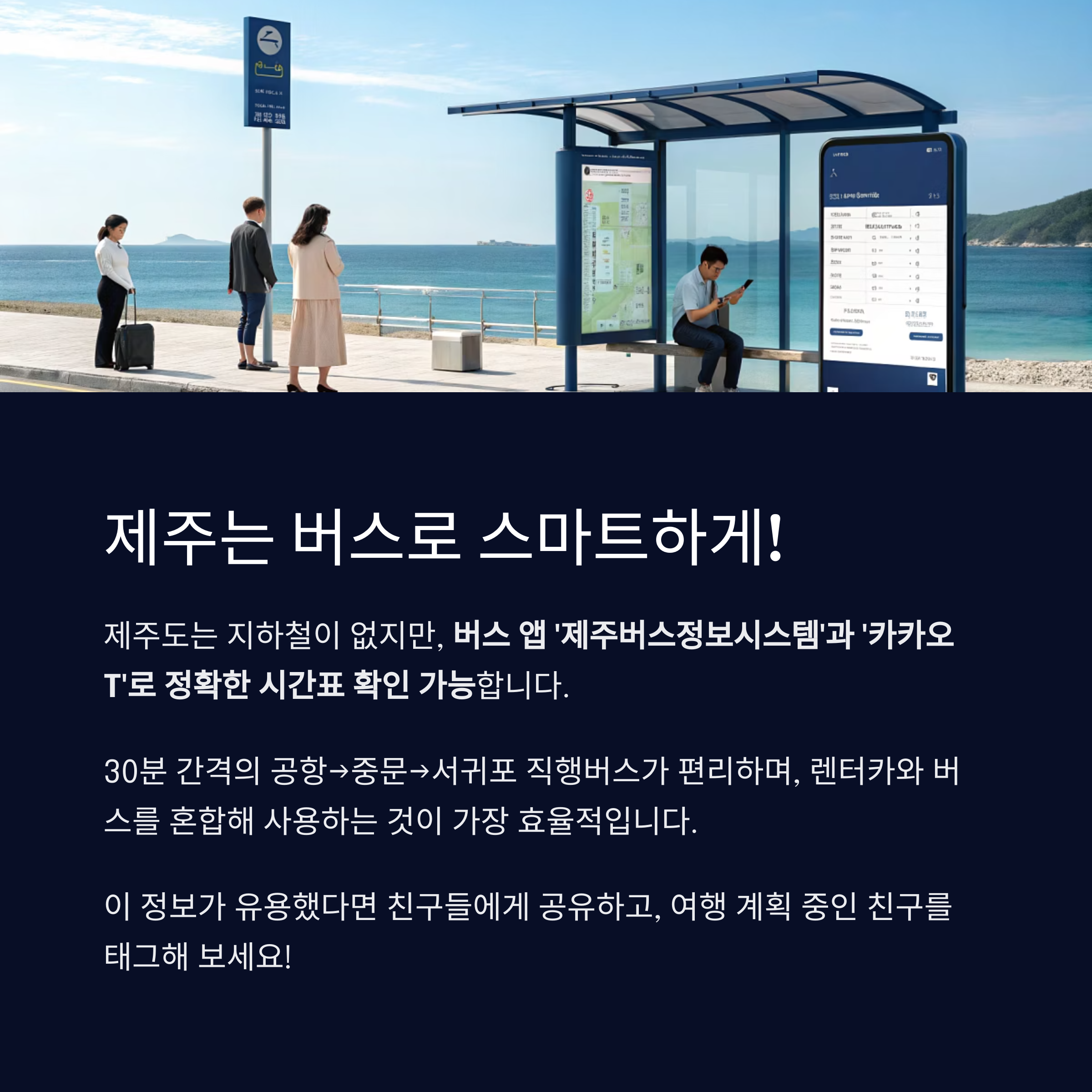 버스 앱 ‘제주버스정보시스템’과 ‘카카오 T’로 정확한 시간표 확인 가능하며