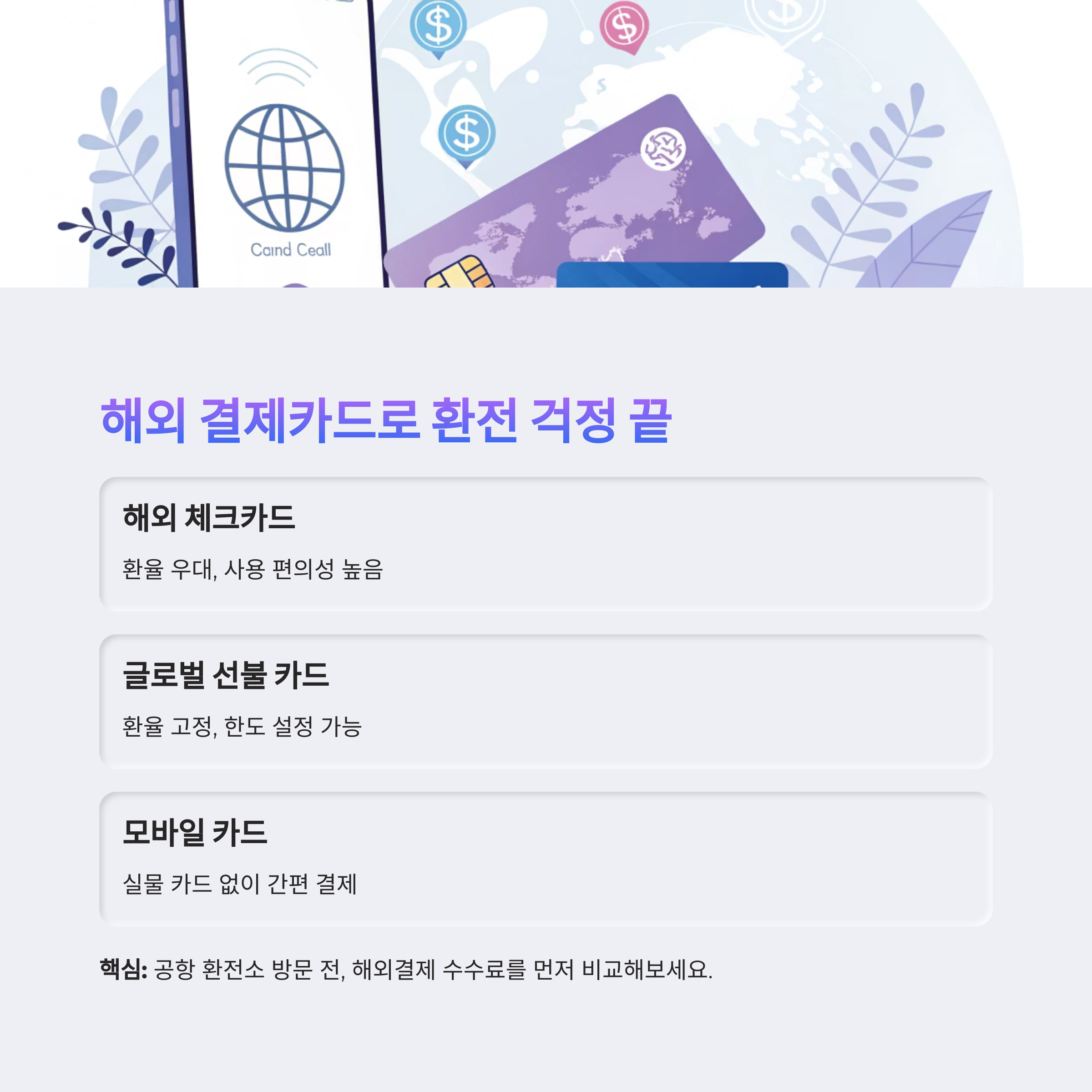 | 글로벌 선불 카드 | 환율 고정, 한도 설정 가능 | 충전 번거로움 |
