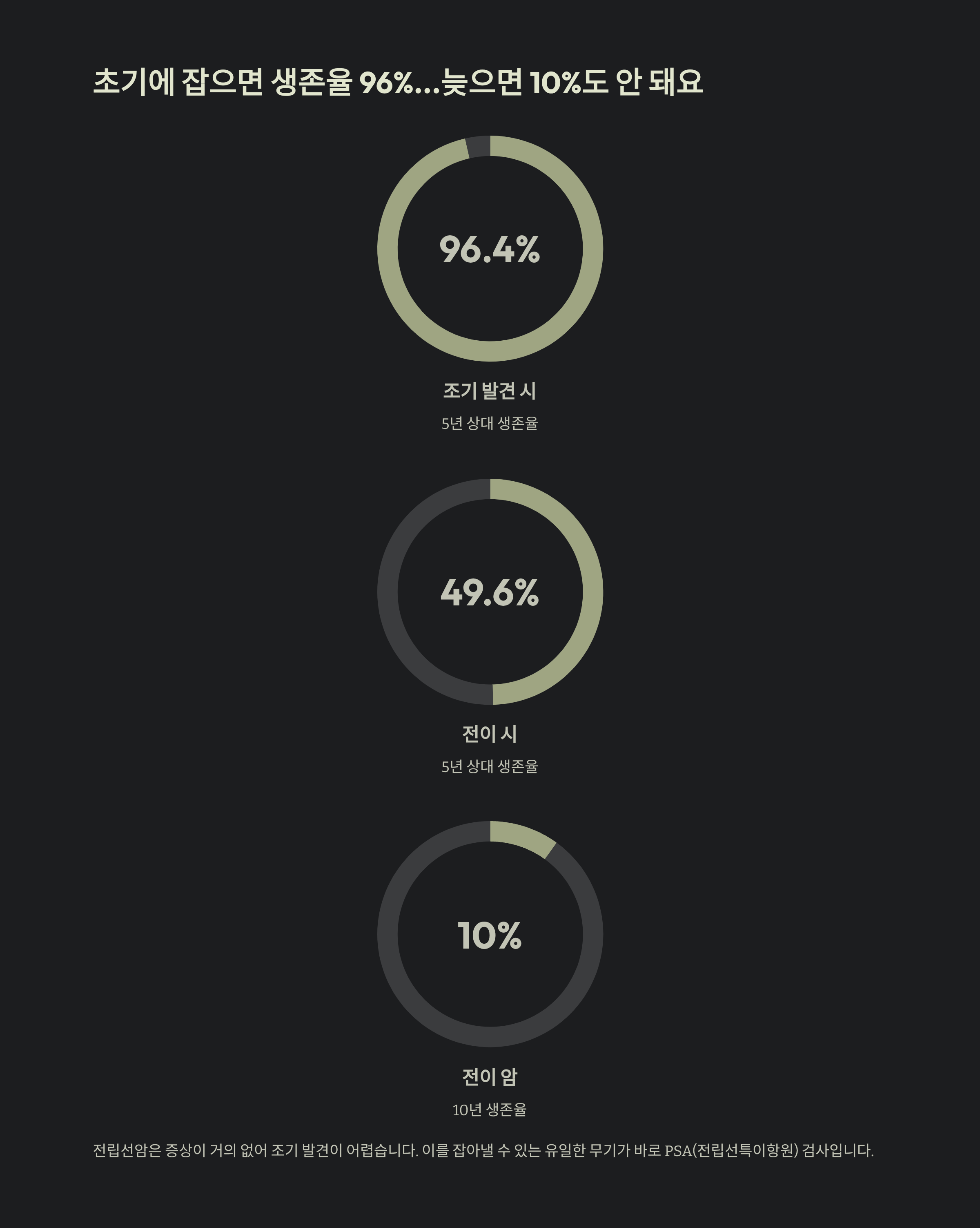 전립선암은 조기 발견 시 5년 생존율이 무려 96.4%에 달합니다.