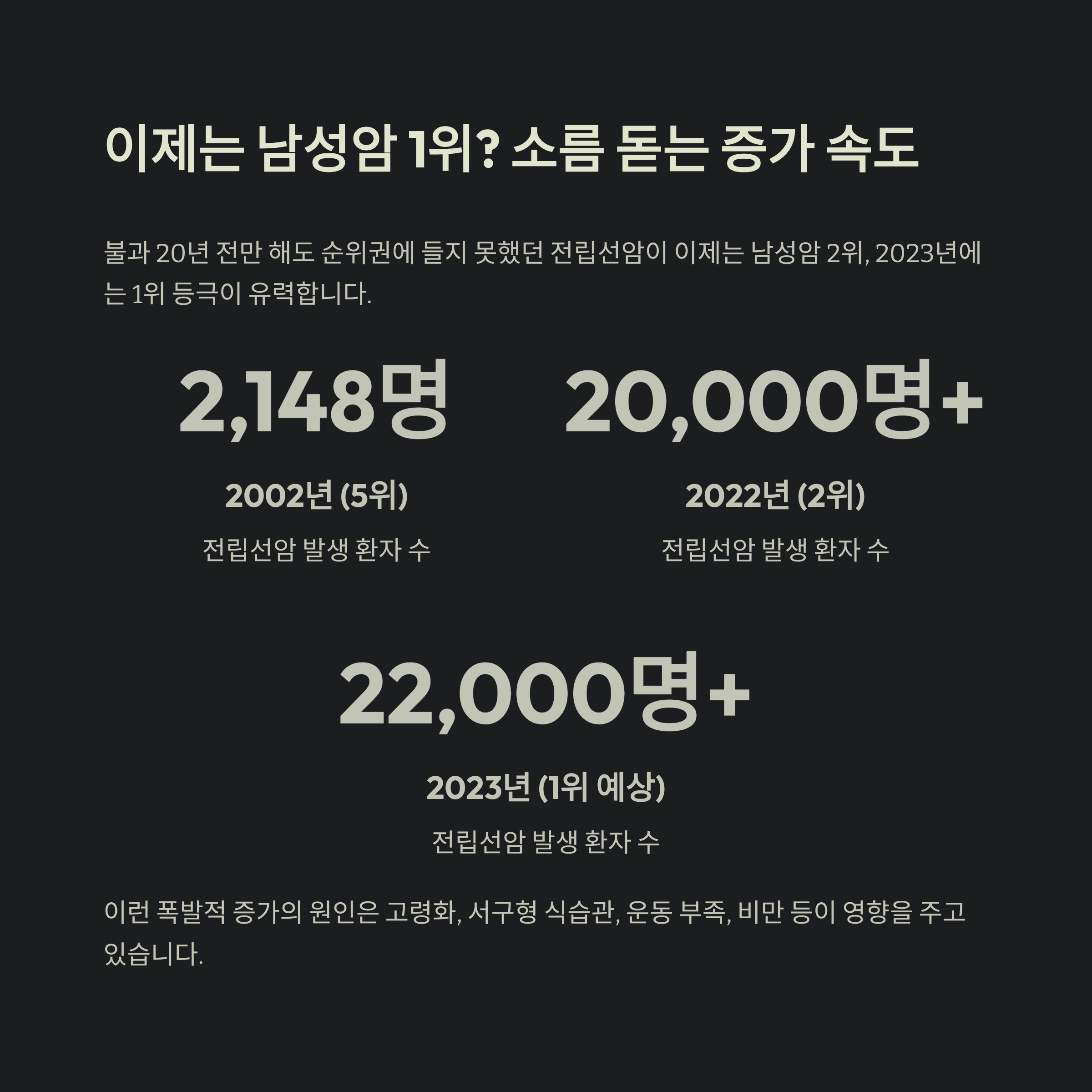 놀라운 사실은, 대한민국에서는 전립선암이 매년 2만 명 이상 발생하고 있음에도 불구하고 국가 건강검진에 포함되지 않는다는 점입니다.