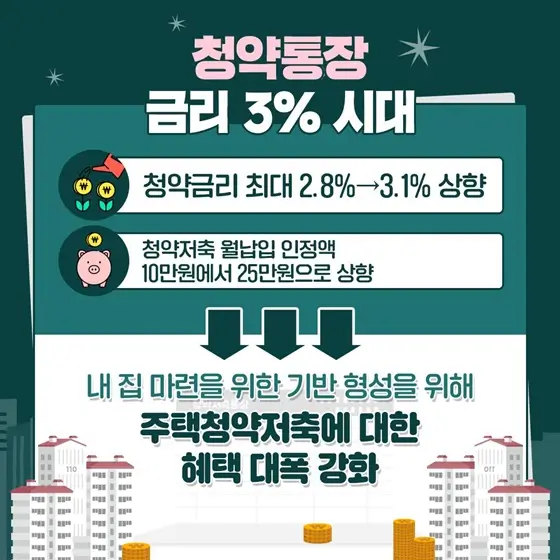 기존 금리가 **2.8%**에서 최대 **3.1%**까지 상향되어 놀랍도록 더욱 매력적입니다. 청약저축의 월납입 인정액 도 기존 10만 원 에서 25만 원 으로 더 많은 혜택을 누리세요.