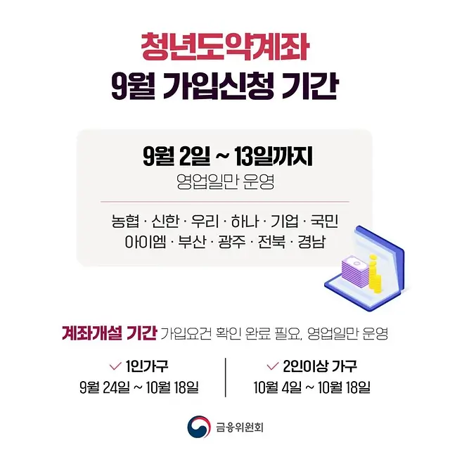 청년도약계좌에 가입하고 싶으신가요? 그렇다면 지금 바로 가입 절차를 확인해보세요!  2024년 9월 2일부터 13일까지 영업일에만 신청이 가능하며, 1인가구와 2인 이상 가구의 가입 기간이 다르게 설정되어 있으므로, 자신의 상황에 맞는 기간을 선택하여 가입하시면 됩니다.