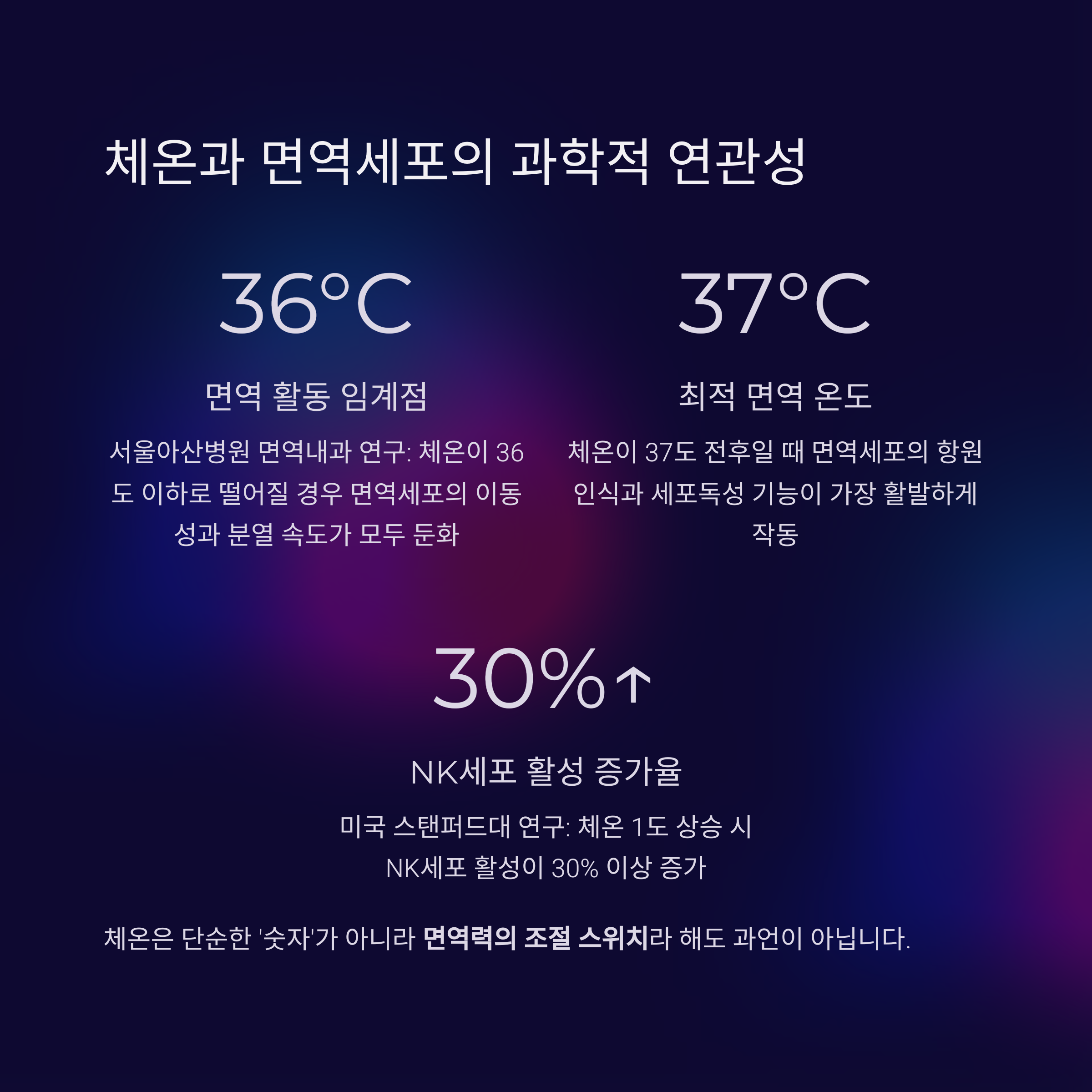 미국 스탠퍼드대 연구진 또한 체온 1도 상승 시 NK세포 활성이 30% 이상 증가한다는