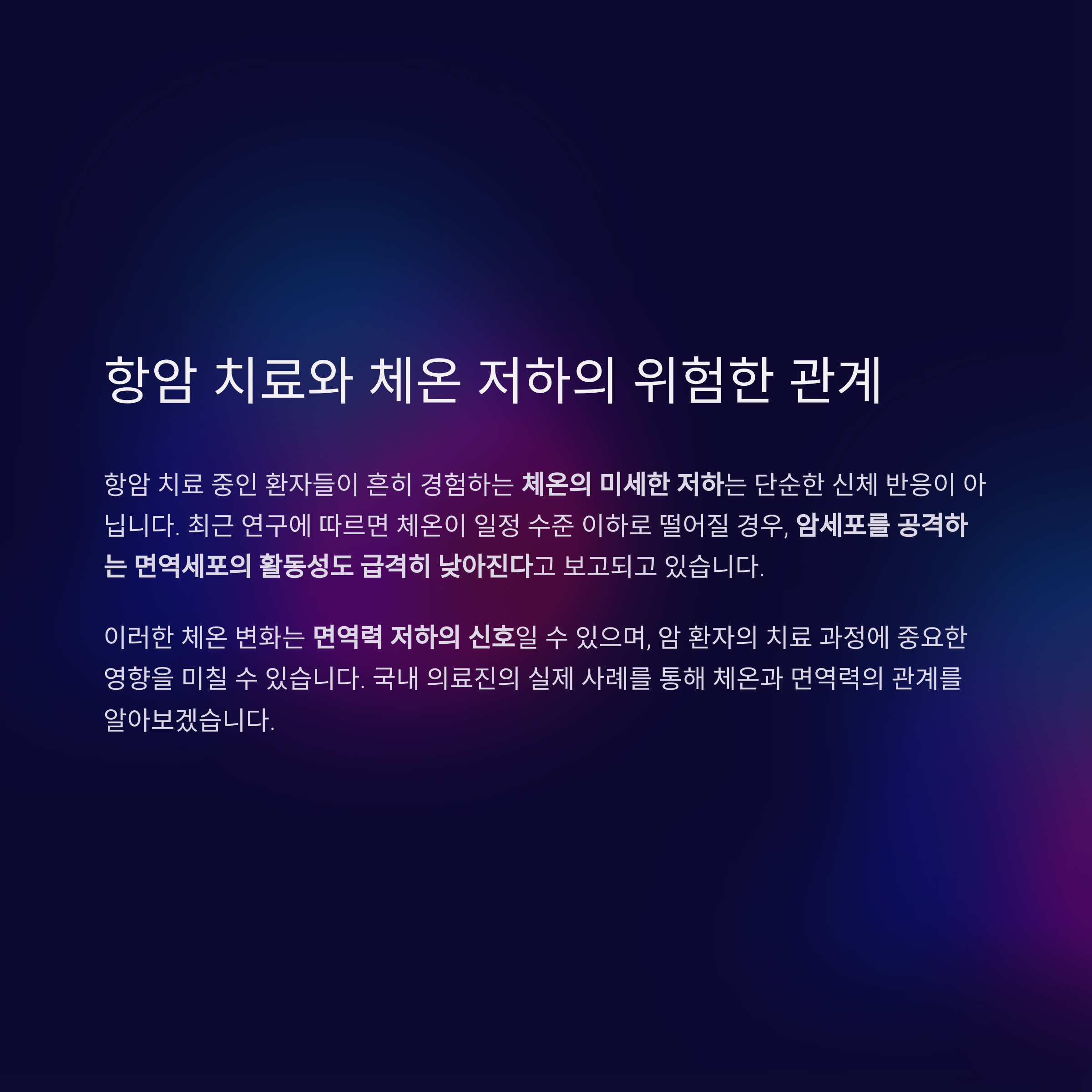 저체온은 체내 대사와 면역 기능을 저하시켜 항암제 효과에도 영향을 줄 수 있습니다.