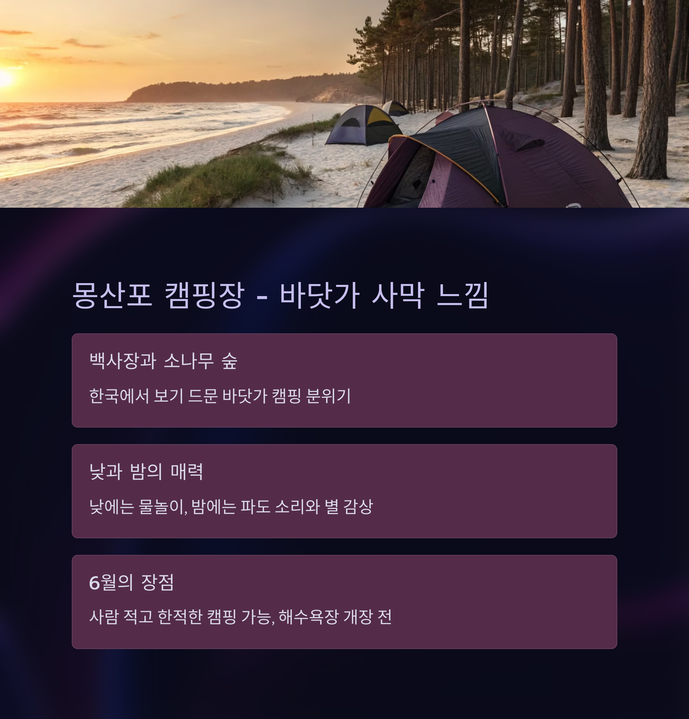 특히 6월은 사람도 많지 않고 해수욕장 개장 전이라 한적한 캠핑을 원하는 이들에게 제격입니다.