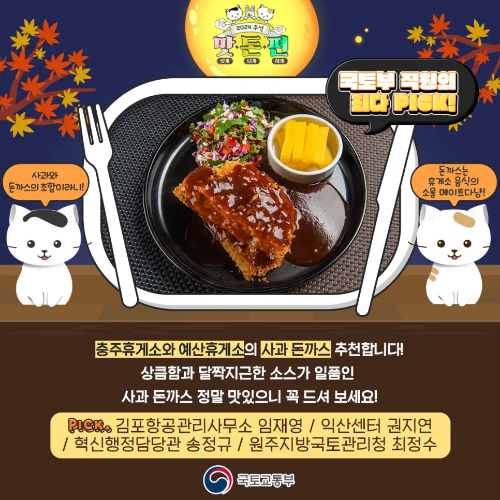 다가오는 추석, 많은 분들이 차를 타고 가족을 만나러 가는 귀성길에 오릅니다. 하지만 긴 운전은 생각보다 더 피로할 수 있죠. 그래서 국토교통부 직원들이 직접 추천하는 전국의 고속도로 휴게소 맛집을 소개해 드립니다! 배도 채우고 기분도 풀릴 수 있는 이 휴게소 맛집들을 미리 알아두면 여행길이 더 즐거워집니다. 자, 함께 알아보실까요?