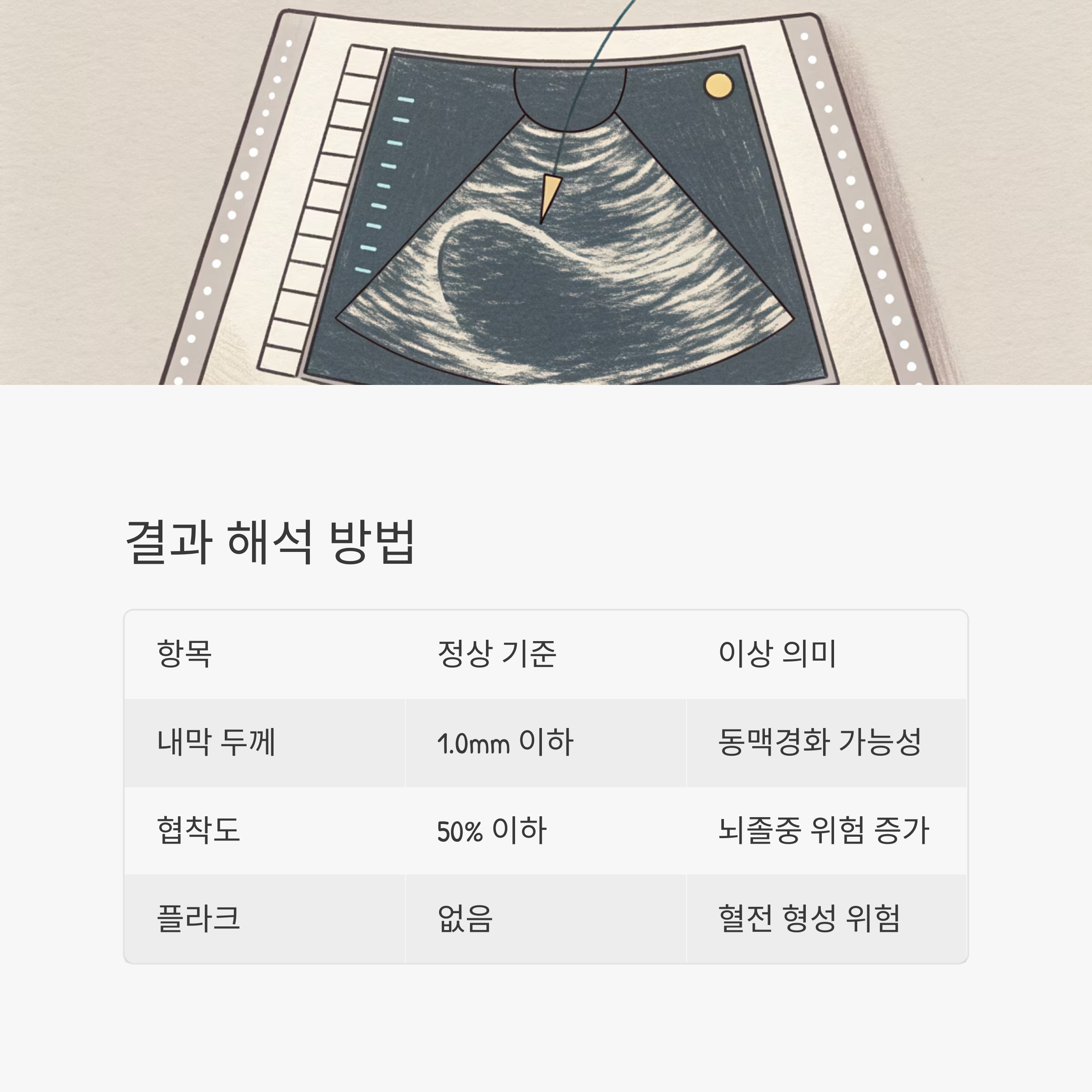 검사 결과는 혈관 내막 두께(IMT), 혈류 속도, 플라크 유무 등을 중심으로 해석됩니다.