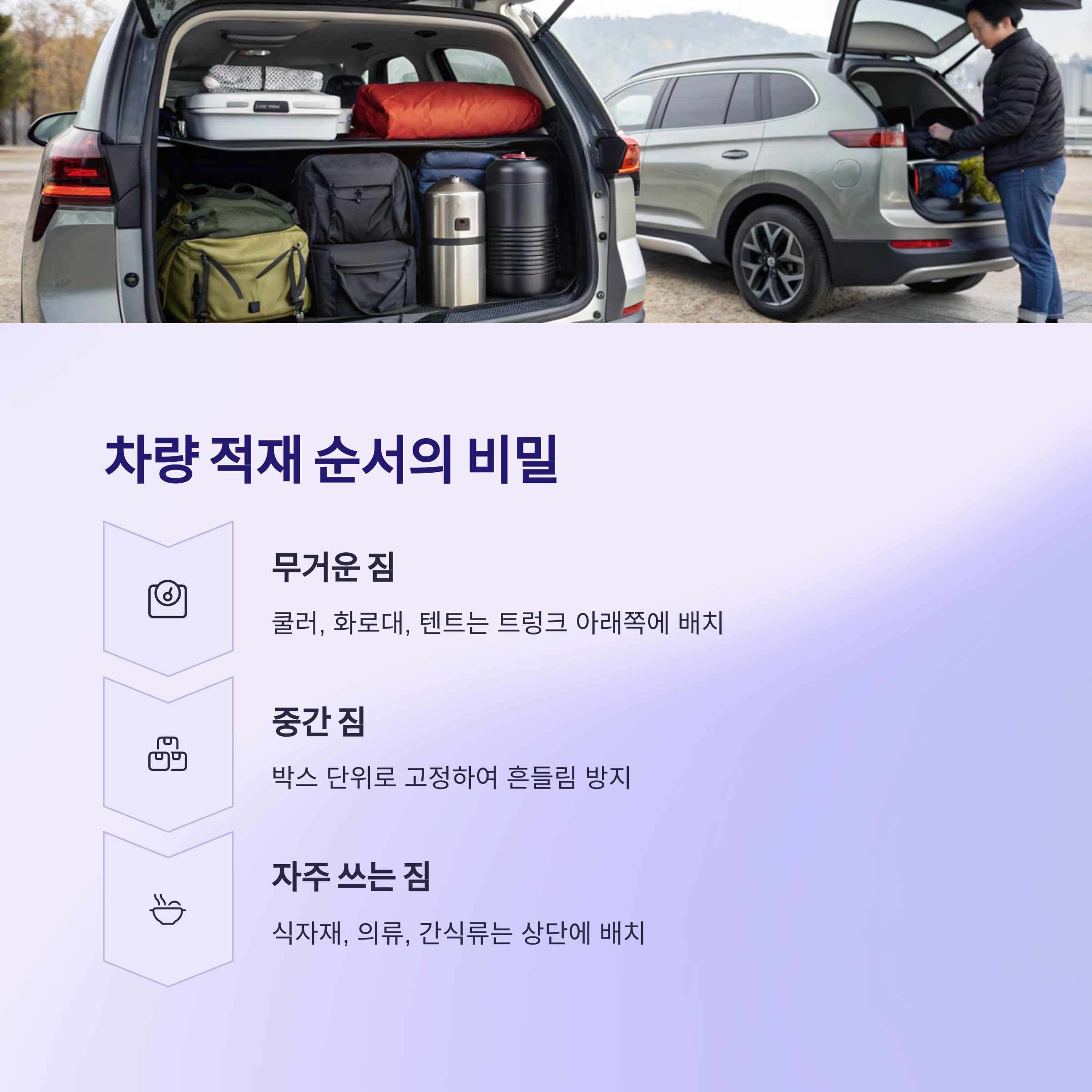 쿨러, 화로대, 텐트는 차량 트렁크 아래쪽 깊숙이