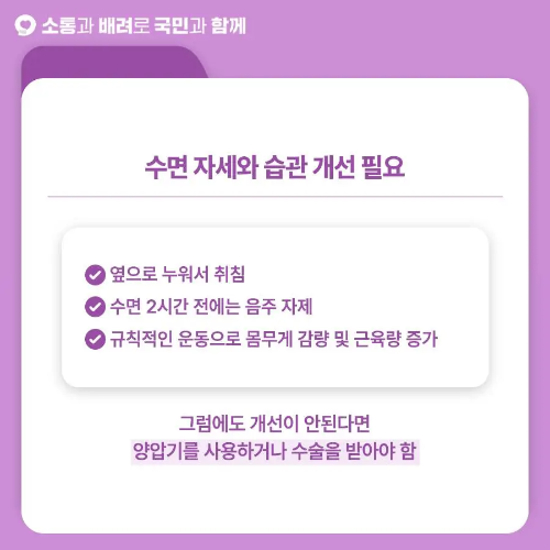 - 음주 자제: 수면 2시간 전에는 음주를 자제하는 것이 좋습니다. 알코올은 근육을 이완시켜 기도를 더 좁아지게 할 수 있습니다.