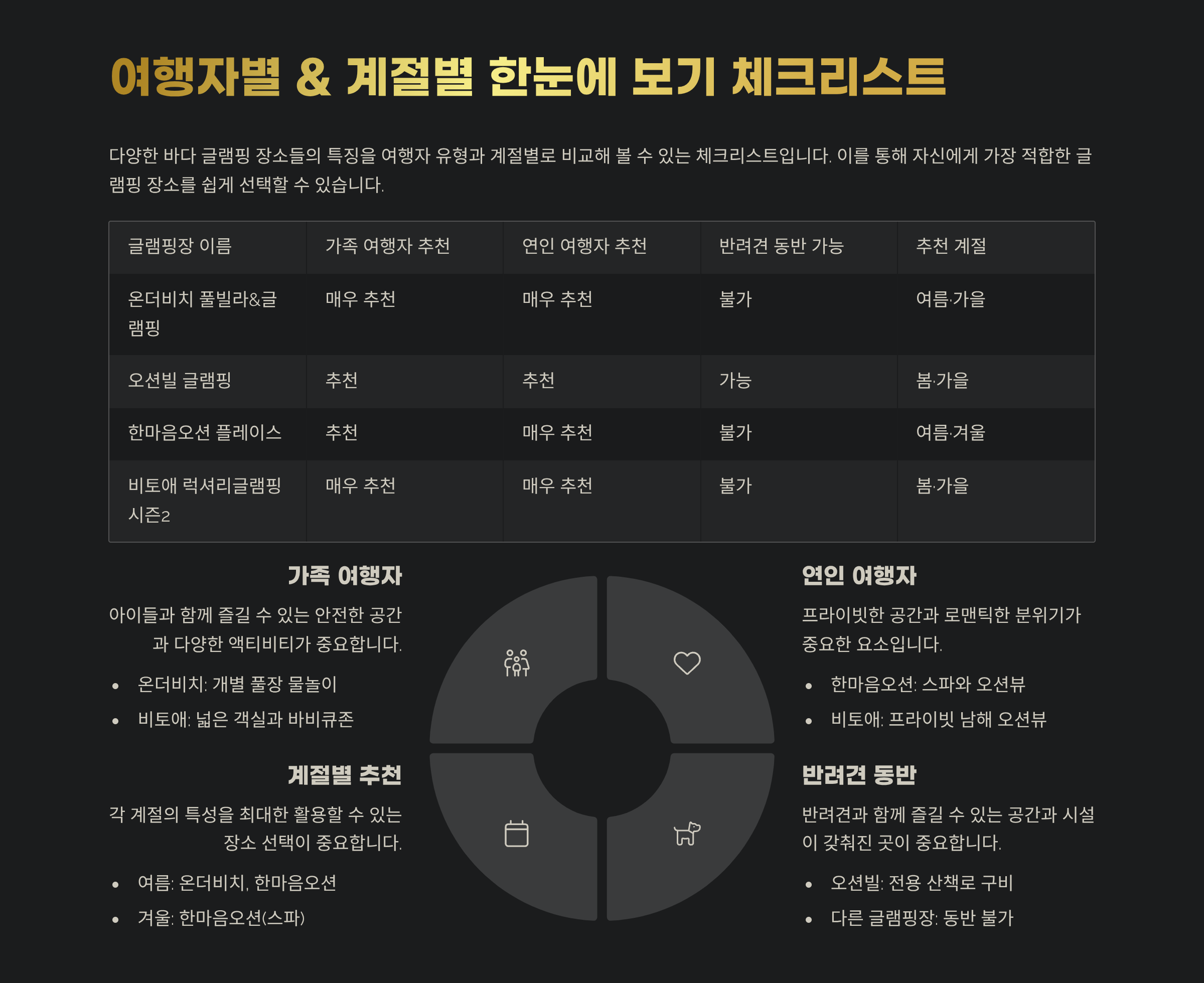 글램핑장 이름 가족 여행자 추천 연인 여행자 추천 반려견 동반 가능 추천 계절