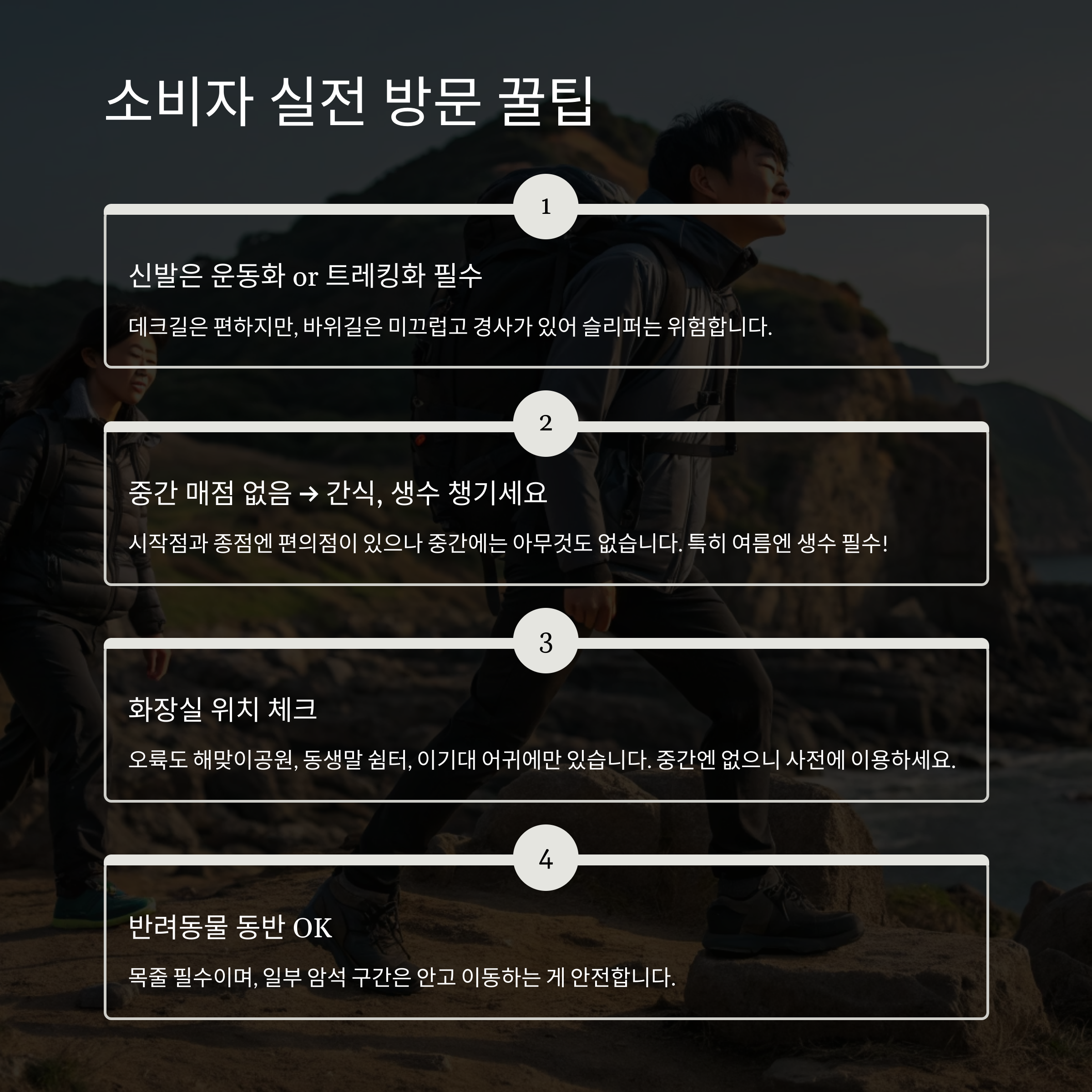 데크길은 편하지만, 바위길은 미끄럽고 경사가 있어 슬리퍼는 위험합니다. - 중간 매점 없음 → 간식, 생수 챙기세요