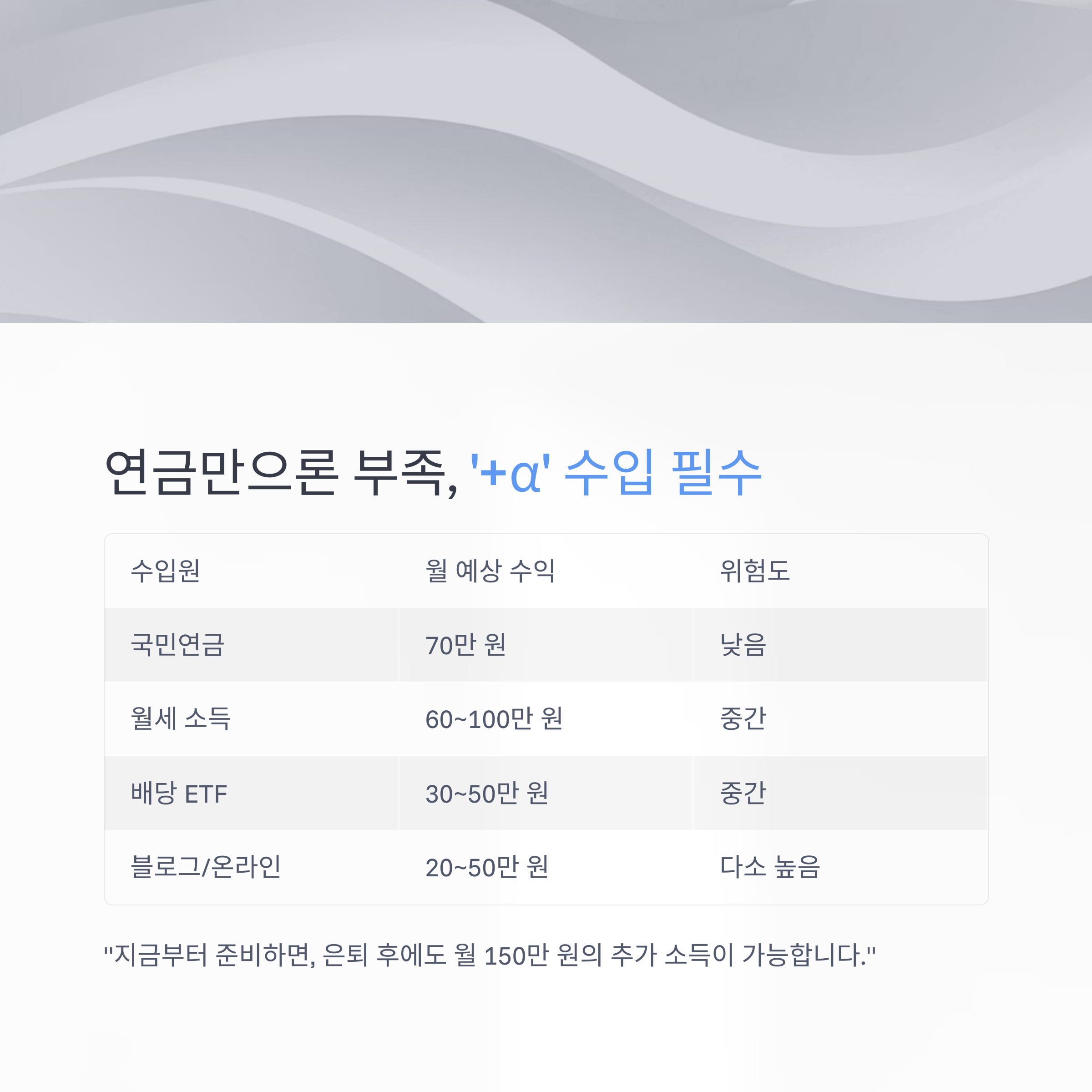 "지금부터 준비하면, 은퇴 후에도 월 150만 원의 추가 소득이 가능합니다."
