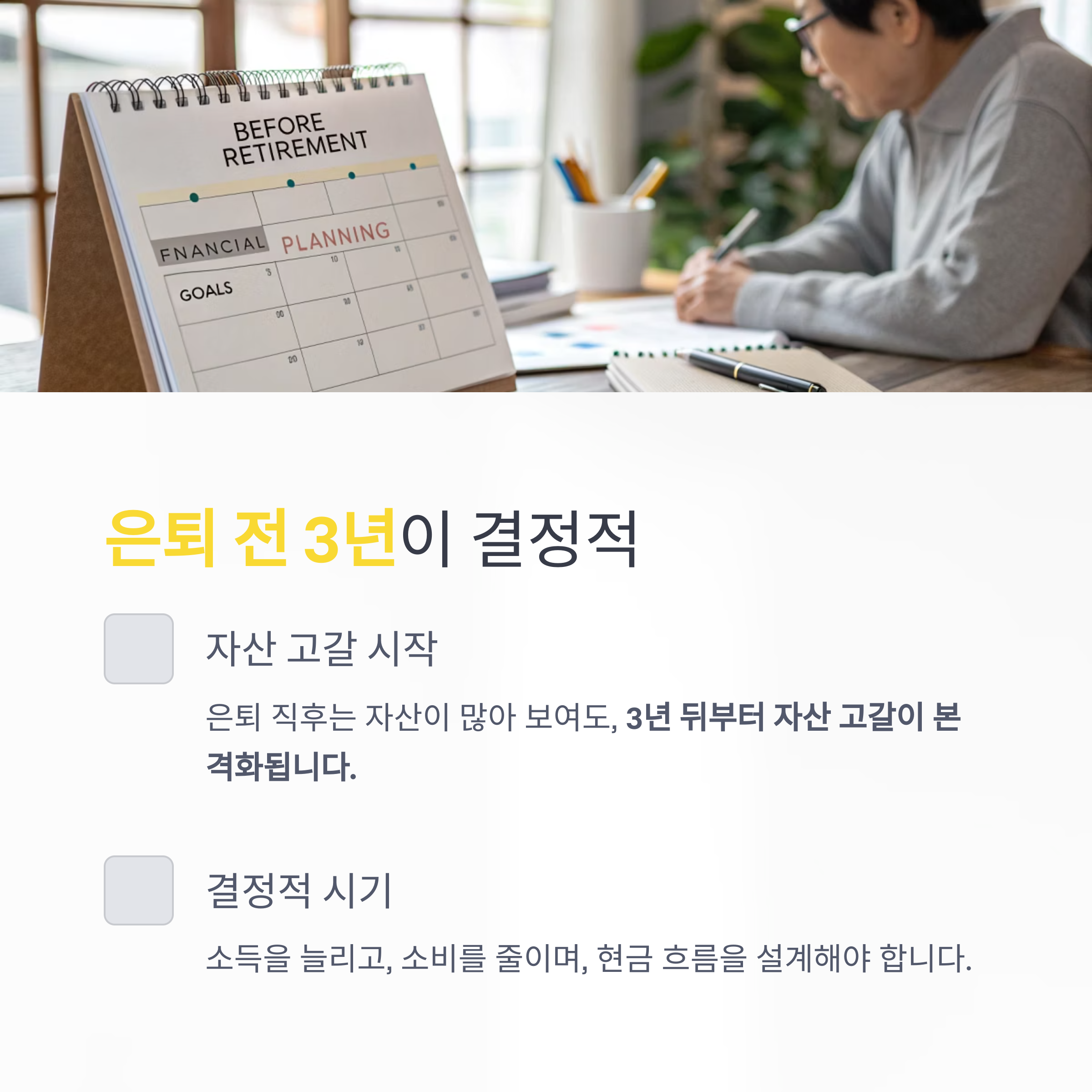 은퇴 직후는 자산이 많아 보여도, 3년 뒤부터 자산 고갈이 본격화됩니다.